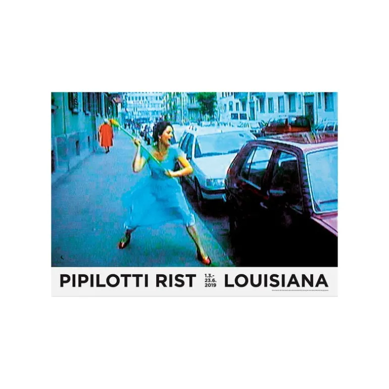 Louisiana Museum of Modern Arts affisch visar en stillbild från Pipilotti Rists videokonstverk Ever is Overall. Rist, som är känd för sina färgstarka videokonstverk, fick en egen utställning på Louisiana 2019. I videon från 1997 går en kvinna beväpnad med en tropisk blomma längs en trottoar i slow motion och använder blomman för att krossa bilfönster. Verket är både förtjusande humoristiskt och lite hotfullt, det leker med faran.