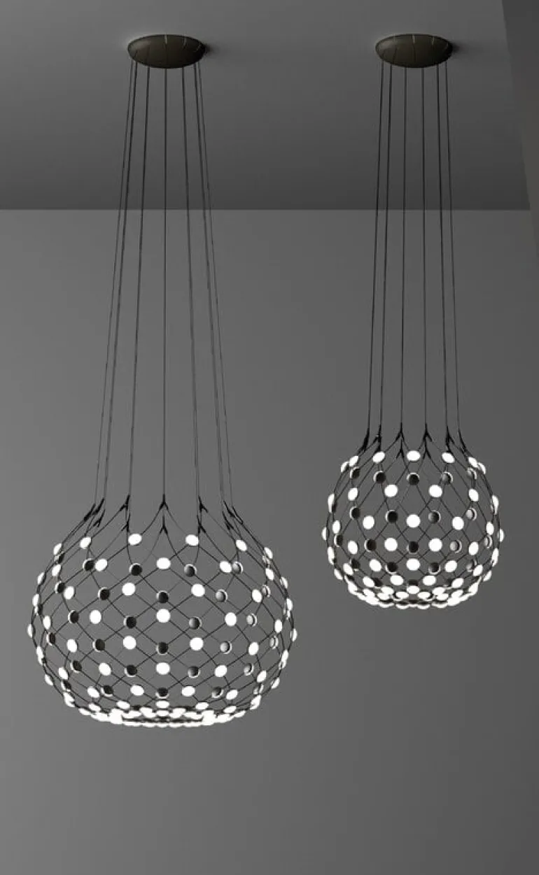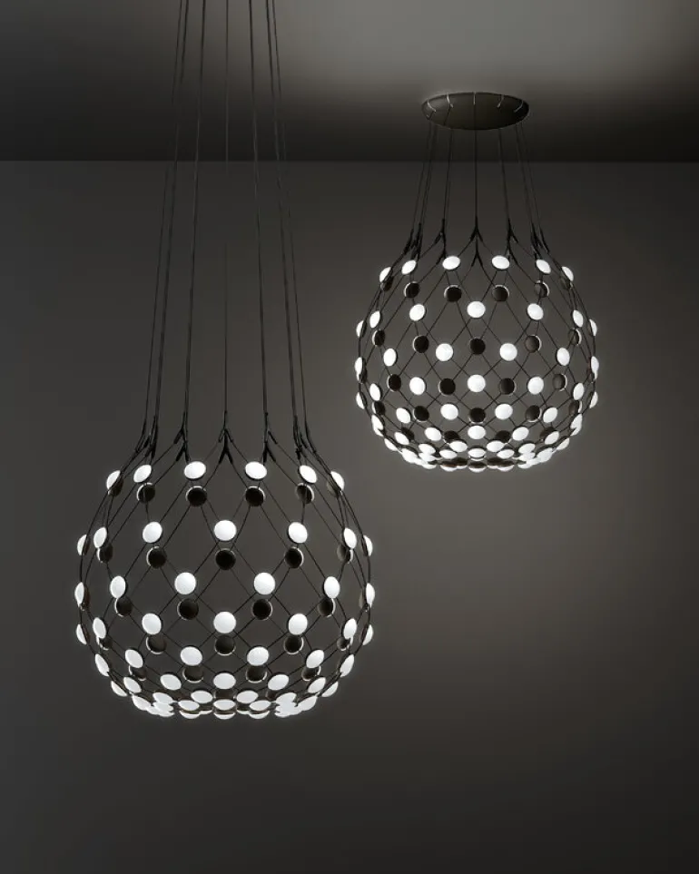 Luceplans Mesh taklampa är en fantastisk ljusskulptur designad av Francisco Gomez Paz år 2017. Istället för en enda ljuskälla har Mesh lampan ett nätverk av otaliga små LED-lampor jämnt fördelade längs ytan på det svarta, symmetriskt hängande stålnätet.