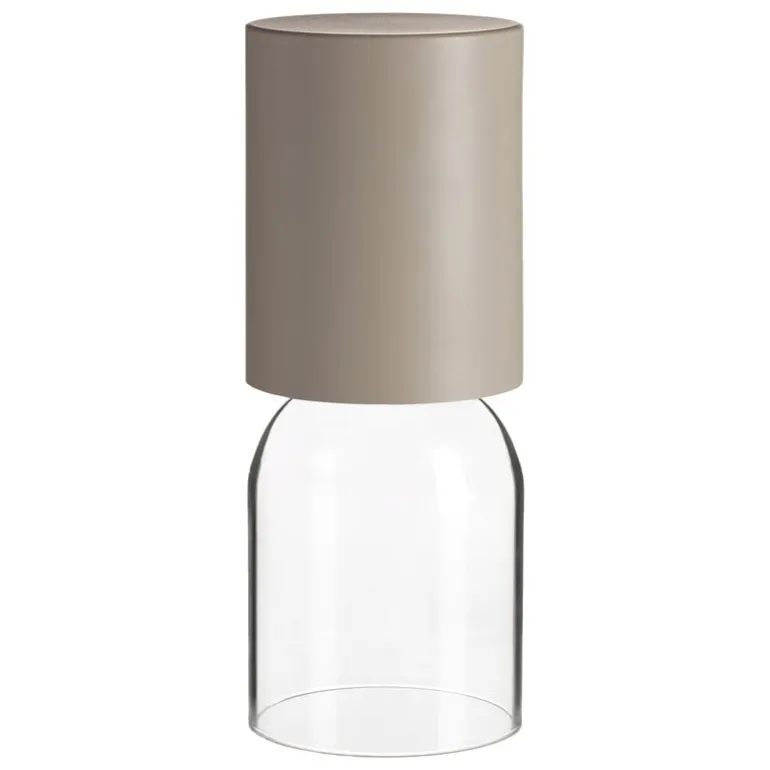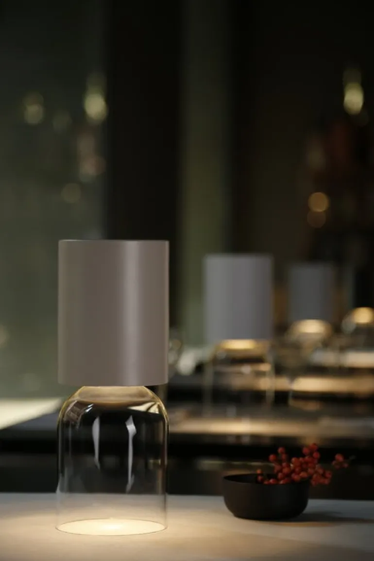 Luceplans bärbara bordslampa Nui Mini är en lekfull men sofistikerad trådlös lampa som kan användas både inomhus och utomhus efter eget tycke. Designad av Meneghello Paolelli och lanserad 2020, består Nui Mini av en transparent glasbas och en metallskärm placerad ovanpå glaset. Inuti skärmen finns en uppladdningsbar ljuskälla som ger bländfritt nedåtriktat ljus, vilket ger glasbasen ett varmt, lyktliknande sken.