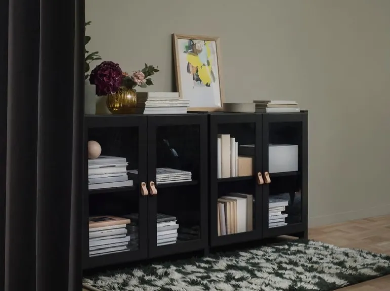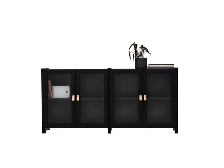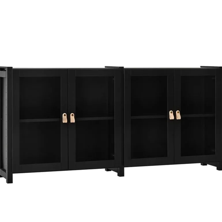 Lundias Moments-skåp är en djärv och rymlig kreation som tillverkats i svartlackerad finsk furu och fulländats med glasdörrar och läderhandtag med mässingsdetaljer.