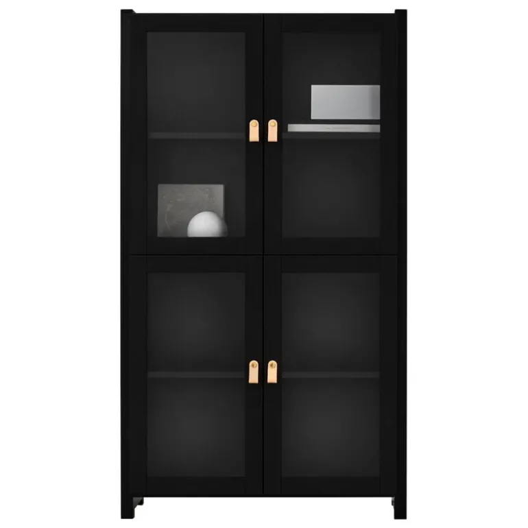 Lundias Moments-skåp är en djärv och rymlig kreation som tillverkats i svartlackerad finsk furu och fulländats med glasdörrar och läderhandtag med mässingsdetaljer.