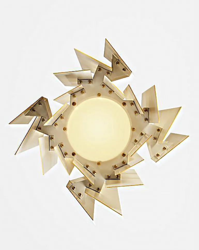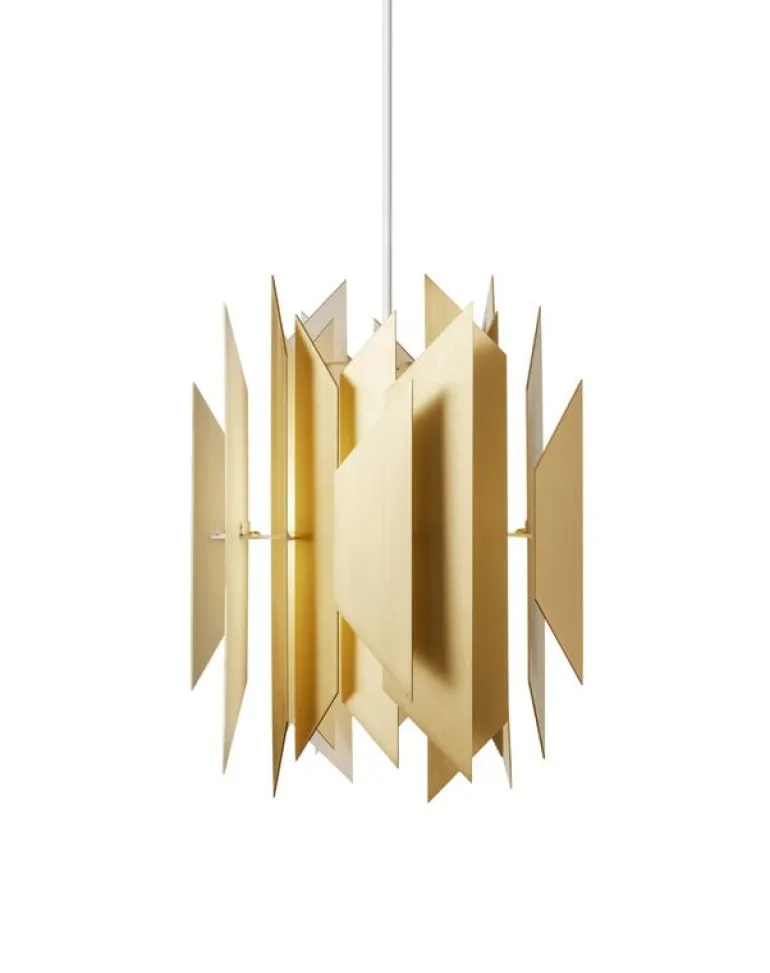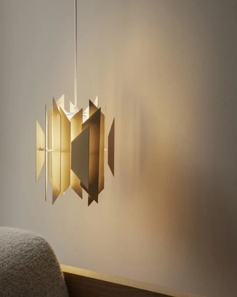 LYFA:s Divan 2 är en imponerande hänglampa designad av Simon P. Henningsen 1962, bestående av överlappande mässingstrapezoider som noggrant monterats en efter en. Även om de definitivt gör armaturen ganska imponerande, är trapezoidernas funktion inte bara estetisk: de filtrerar också ljuset på ett sätt som gör det behagligt och bländfritt. Som ett resultat ger Divan 2 hänglampa ett mjukt, indirekt ljus.
