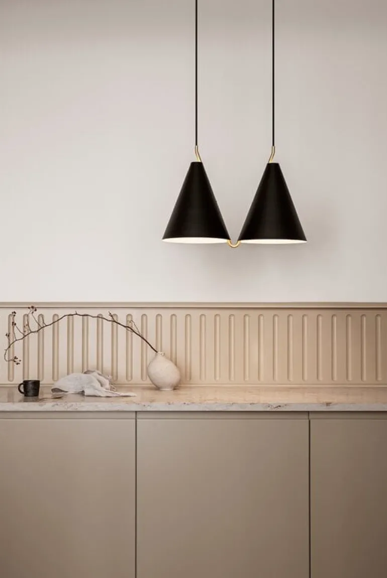 LYFA:s hänglampa Mosaik Sidebyside är en klassiker inom belysning, designad av Bent Karlby 1959. Dess design baseras på två element: koniska skärmar och en dekorativ mässingsrör som fungerar som lampans upphängning och kopplar samman de två separata skärmarna. Konerna riktar det mesta av ljuset nedåt, men de öppna topparna tillåter små strömmar av ljus att riktas mot taket samtidigt som de belyser mässingsrören.