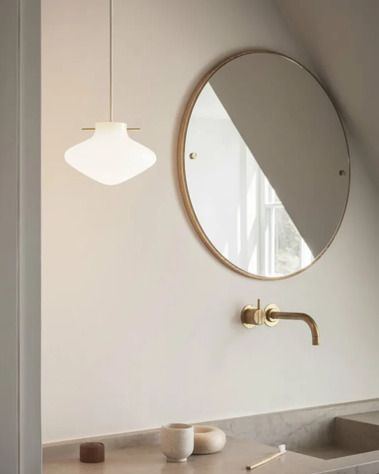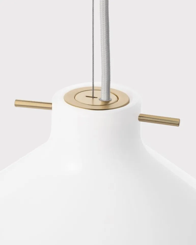 Vi ville ge stor betydelse till den minsta detaljen i lampan – den tunna pinnen som går genom glasskärmen. En väsentlig designelement som håller skärmen samtidigt som den skapar en lugn och svävande känsla av balans, säger formgivarna.