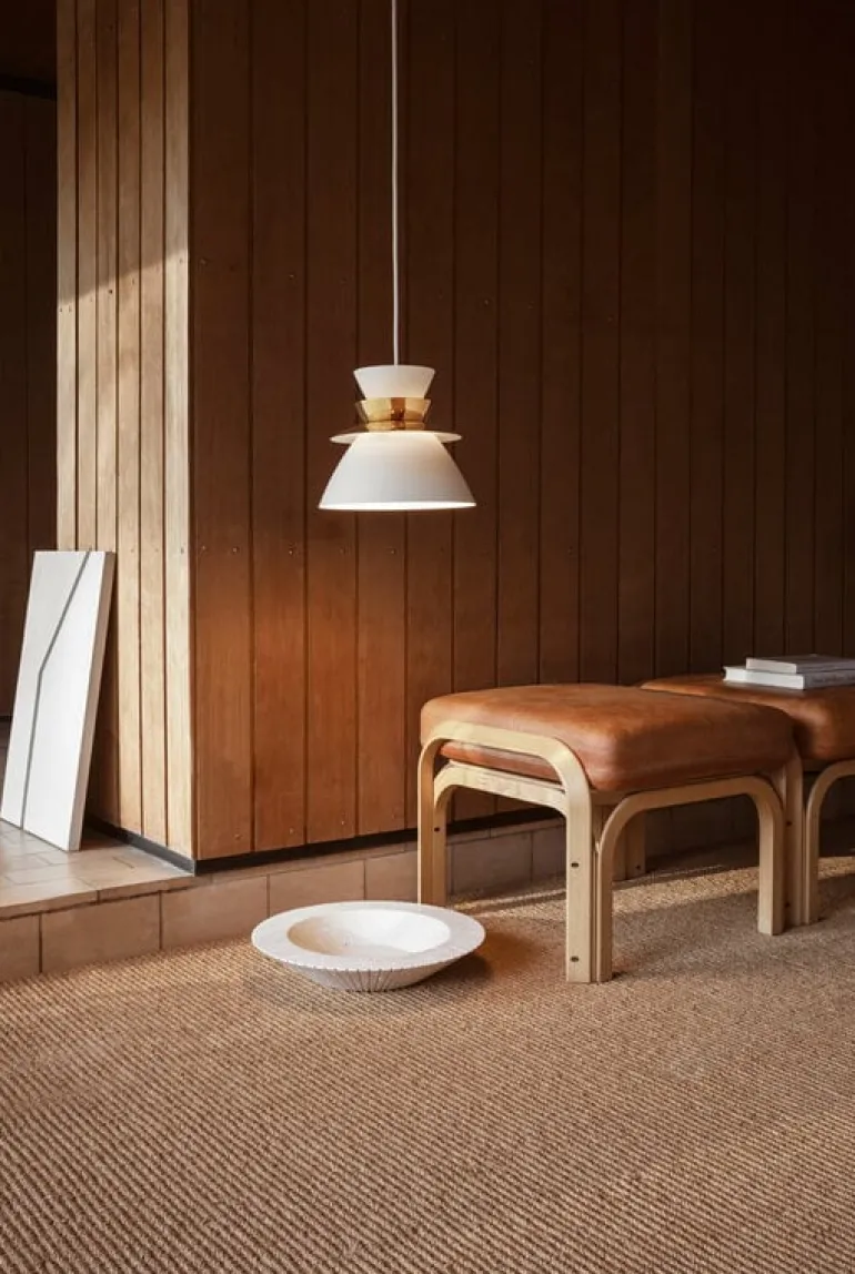 Pendellampan Sundowner från LYFA, formgiven av Jørn Utzon 1948, kännetecknas av sin eleganta konstruktion som inte bara speglar sin tid, utan också de många visuella och tekniska funktionerna som är typiska för Utzons arbete. Lampans metallskärm består av fyra skal vända åt motsatta håll, vilkas form kanske får dig att tänka på ett annat berömt verk av Utzon: operahuset i Sydney.