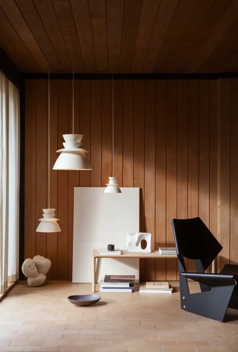 Pendellampan Sundowner från LYFA, formgiven av Jørn Utzon 1948, kännetecknas av sin eleganta konstruktion som inte bara speglar sin tid, utan också de många visuella och tekniska funktionerna som är typiska för Utzons arbete. Lampans metallskärm består av fyra skal vända åt motsatta håll, vilkas form kanske får dig att tänka på ett annat berömt verk av Utzon: operahuset i Sydney.