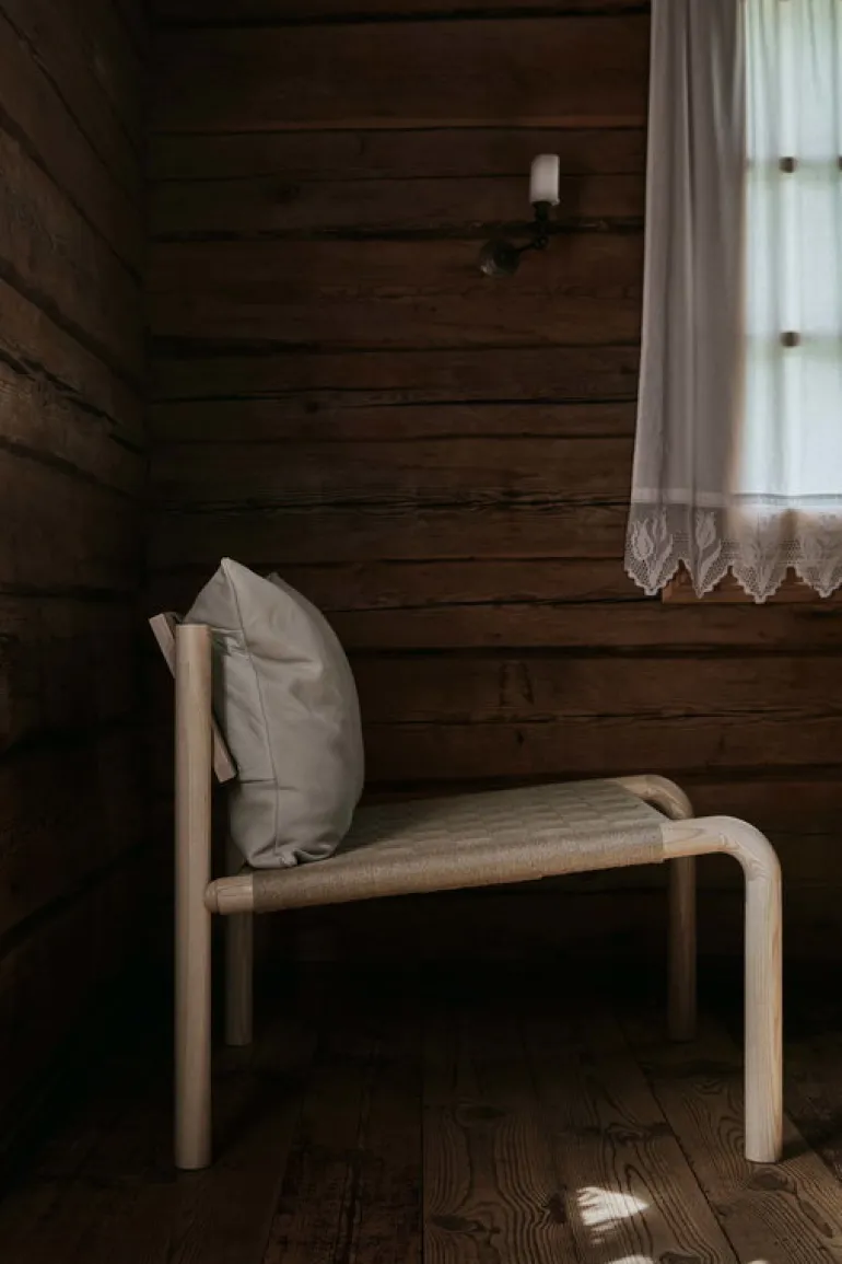 Loungestolen Kaski, från Made by Choice, har ett charmigt och minimalistiskt utseende som kombinerar rena, moderna linjer med en säregen rustik känsla. Stolen består av en slank ram i askträ som kompletteras med en vävd sits i linne och en läderkudde som ger designen en mjuk touch – både bokstavligt talat och rent visuellt.