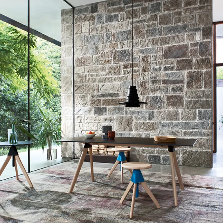 Tom och Jerry från Magis är Konstantin Grcics lekfulla tolkning av den typiska verkstadspallen. Ramen är tillverkad i massiv bok och de mekaniska delarna utgörs av självsmörjande polypropen. De färgglada, friktionsfria plastdelarna är en rolig kontrast till träbenen och sitsen, och gör pallarna enkla och trivsamma att använda. Barstolen Tom är perfekt till barer och köksöar, medan den lägre pallen Jerry passar lite överallt, från kontor till barnrum.