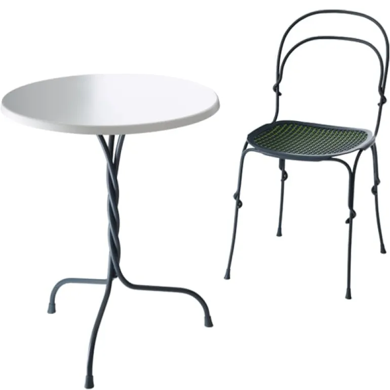 Bordet Vigna från Magis gör alla typer av balkonger och trädgårdar lite vackrare – bordet passar lika bra inomhus som ute i det fria. Martino Gamper designade bordet Vigna 2011, underdelen är tillverkad av snurrade stålstänger medan bordsytan är gjord av slitstark och lättskött Werzalit.