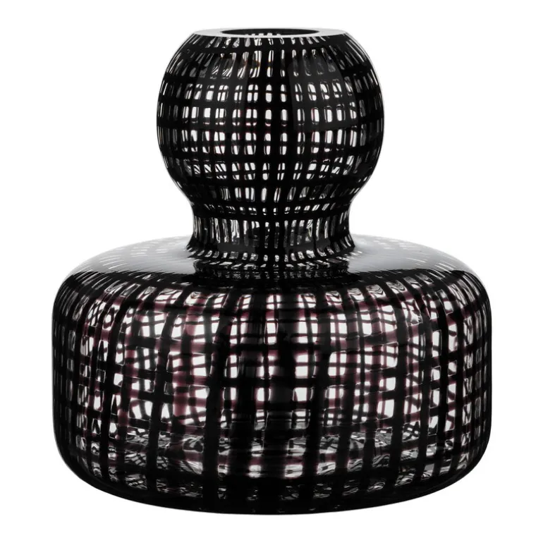 Flower-vasen är tillverkad av munblåst glas och är 10,4 cm hög. Den har ett handmålat, svart rutmönster som ger en lekfull kontrast till fina ängsblommor eller små kvistar.