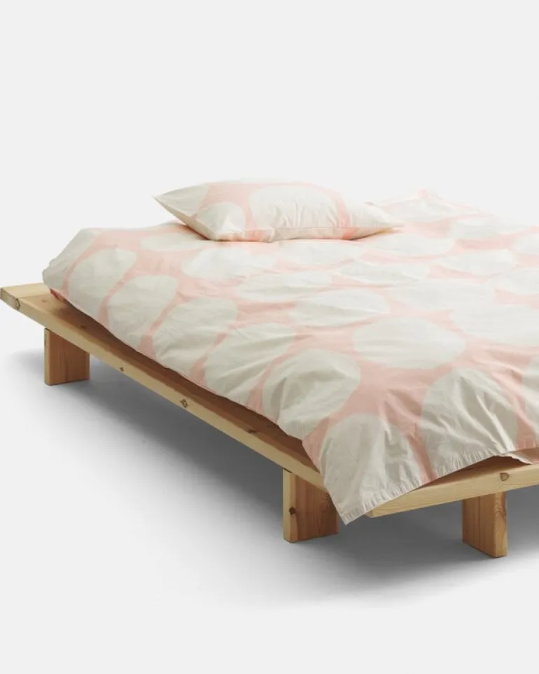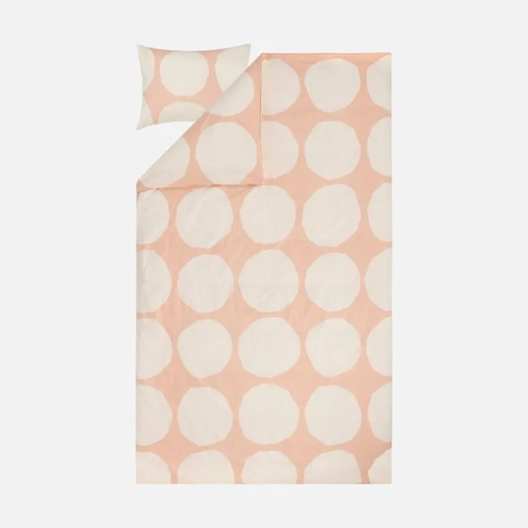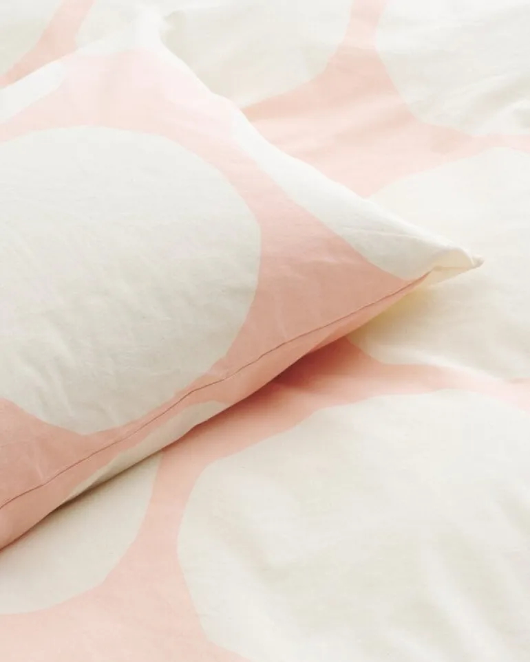 Marimekkos örngott Kivet är prytt med ett mönster av kantstötta cirklar som designades av Maija Isola 1956. Kivet, som betyder sten på finska, är inspirerad av de stora stenar som grävdes upp från trädgården vid konstnärens ateljé. Kivet-mönstret går i rosa och vita nyanser, vilket ger örngottet en geometrisk men ändå mjuk och varm känsla.