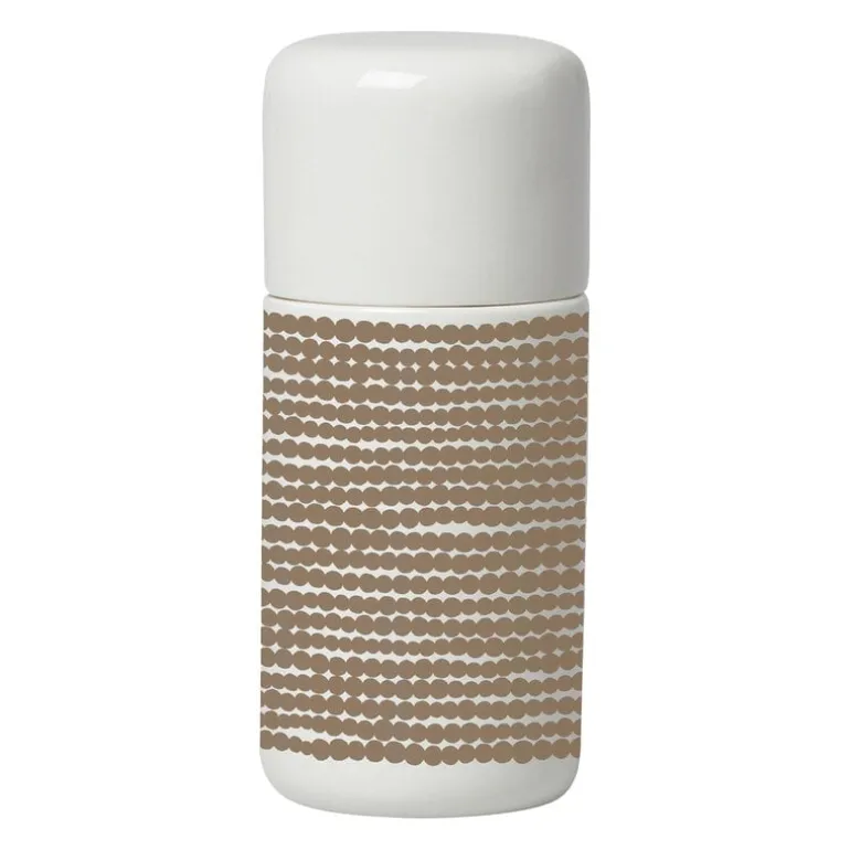 Marimekkos Siirtolapuutarha kryddkvarn pryds av Maija Louekaris förtjusande Räsymatto-mönster i mjuka nyanser av vitt och beige. Den vackra kryddkvarnen i stengods ger ett karismatiskt inslag i köksinredningen – och den är också en idealisk present till en passionerad matälskare!