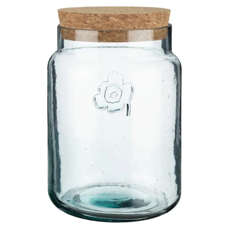 Marimekkos Oiva-burk är en stilfull stor behållare tillverkad av glas och dekorerad med det ikoniska Unikko-mönstret designat av Maija Isola. Den friskt grönaktiga glasburken är en förtjusande förvaringslösning för badrummet, hemmakontoret och köket. Det lufttäta korklocket säkerställer att mjöl, pasta, kaffe och andra torra ingredienser är väl skyddade. Utan locket fungerar burken också som en blomvas.