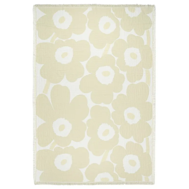 Marimekkos Unikko-filt är prytt med Maija Isolas ikoniska blommönster i lugna vita nyanser. Den jacquardvävda filten, som har en livfull, texturerad yta, är tillverkad av 100 % ekologisk bomull och avslutas med fransar. Mönstret är omvänt på andra sidan, vilket ger en kontrasterande färgskala.
