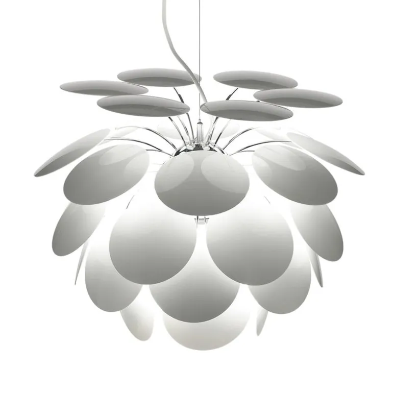 Pendellampan Discocó 53 från Marset drar blickarna till sig då den låter ljuset, skuggorna och formerna dansa. Discocó, formgiven år 2009 av Christophe Mathieu, är byggd på en förkromad ram som omges av runda skivor som reflekterar ljuset på båda sidor och gör lampan bländfri. Tack vare sin skulpturala design blir Discocó ett fint komplement till middagsbordet eller ett stort öppet utrymme. Dessutom har lampan en fängslande estetik även när den är släckt.