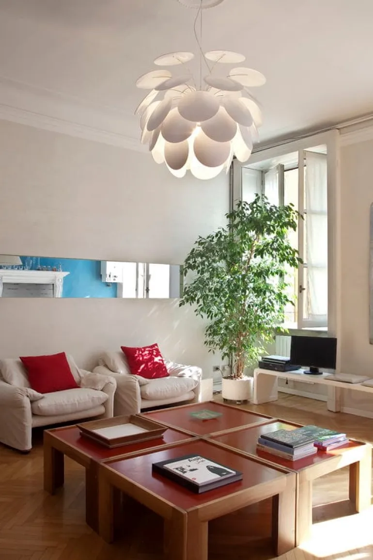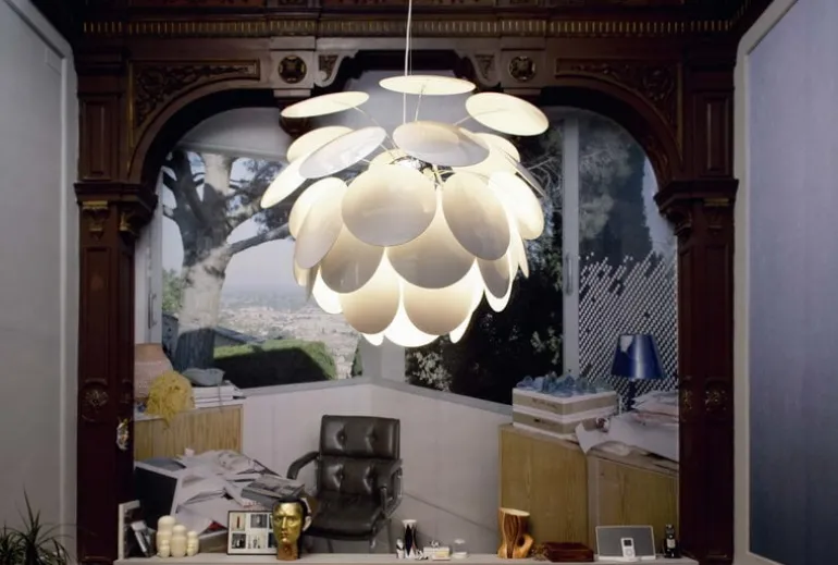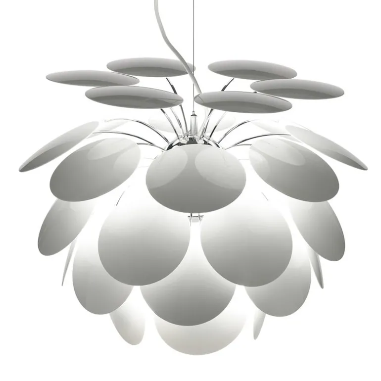 Pendellampan Discocó 68 från Marset drar till sig blickar med sin kombination av ljus, skugga och former. Discocó, formgiven år 2009 av Christophe Mathieu, är byggd på en förkromad ram som omges av runda skivor som reflekterar ljuset på båda sidor och gör lampan bländfri. Tack vare sin skulpturala design blir Discocó ett fint komplement till middagsbordet eller ett stort öppet utrymme. Dessutom har lampan en fängslande estetik även när den är släckt.