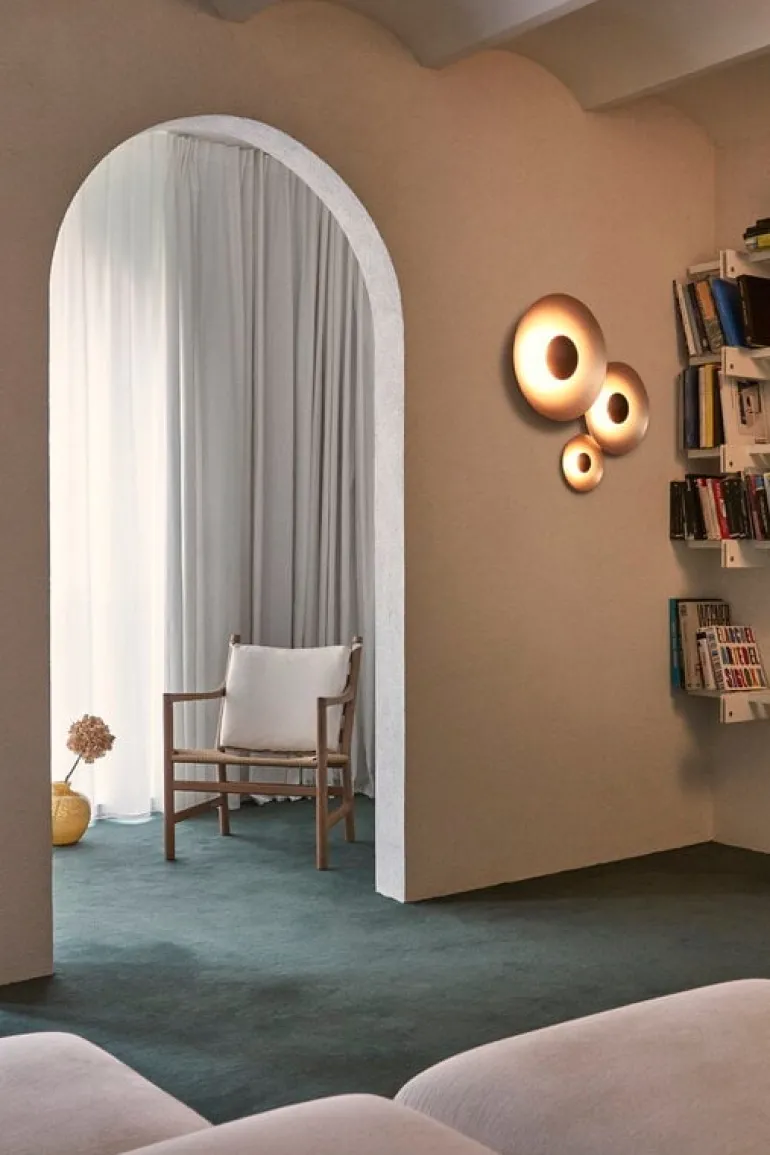 Marsets lampa Ginger 32C ingår i den namngivna kollektionen som bygger på designer Joan Gaspars studier av trä, ljus och design. Istället för trä förenar denna lampa ljus med metall: dess mest grundläggande element är den breda aluminiumlampskärmen med en borstad, mässingfärgad finish. Lampans dimbara inbyggda LED-enhet har placerats bakom en aluminiumbländskydd som riktar ljuset mot den mässingfärgade ytan, vilket ger ljuset en varm, inbjudande ton.