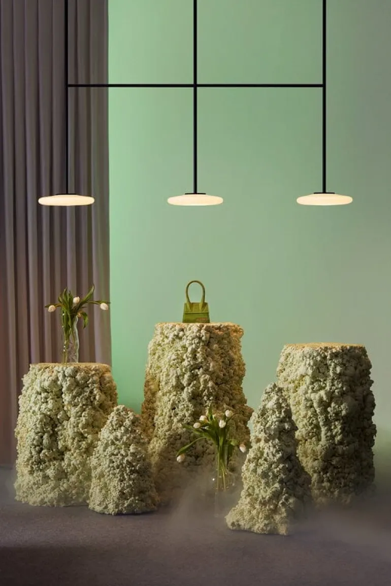 Marsets pendellampa Ihana är designad av den finska arkitekten Joanna Laajisto. Ihana, som betyder ”utsökt”, på finska föddes när Laajisto flyttade till sin nya studio och inte kunde hitta en lampa som passade i utrymmet med högt i tak. Den luftiga och tidlösa lampan består av flera opal-formade ljusspridare och en kraftig svart metallram, som tillsammans skapar en vacker kontrast i rummet.