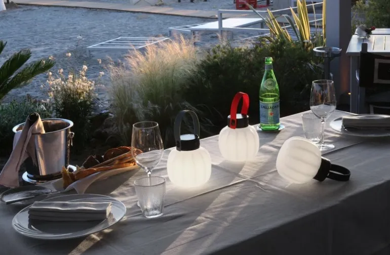 Martinelli Luce’s bärbara lampa Kiki låter dig belysa inomhus- och utomhusutrymmen var du än vill. Du kan hänga den trådlösa lampan på en väggkrok eller trädgren med hjälp av dess färgglada handtag, eller placera den stående på ett matbord eller picknickfilt.