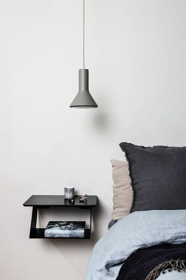 Edgy-hyllan från svenska Maze består av en liten bordsskiva och en metallhylla under den. Den väggmonterade hyllan passar perfekt som ett nattduksbord men kan även placeras i andra utrymmen där extraförvaring behövs, exempelvis i hallen eller vardagsrummet.
