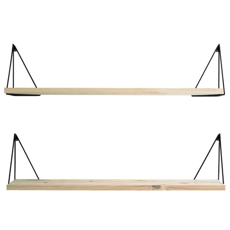 Pythagoras Play kommer i ett tvådelat set med fyra väggkonsoler i metall. Hyllornas furu produceras från