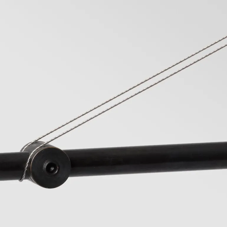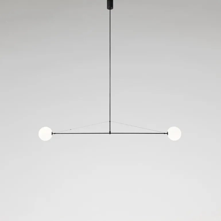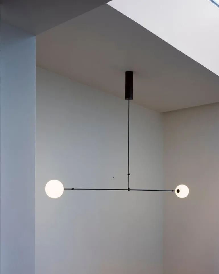 Mobile Chandelier 2 har en vackert patinerad ram i svart mässing som bär upp två munblåsta glaskupor. De eleganta linjerna och den luftiga strukturen gör Mobile Chandelier till ett perfekt blickfång, oavsett om den placeras över matbordet, i vardagsrummet eller i en mer krävande arkitektonisk miljö.