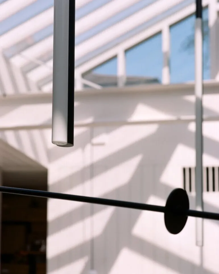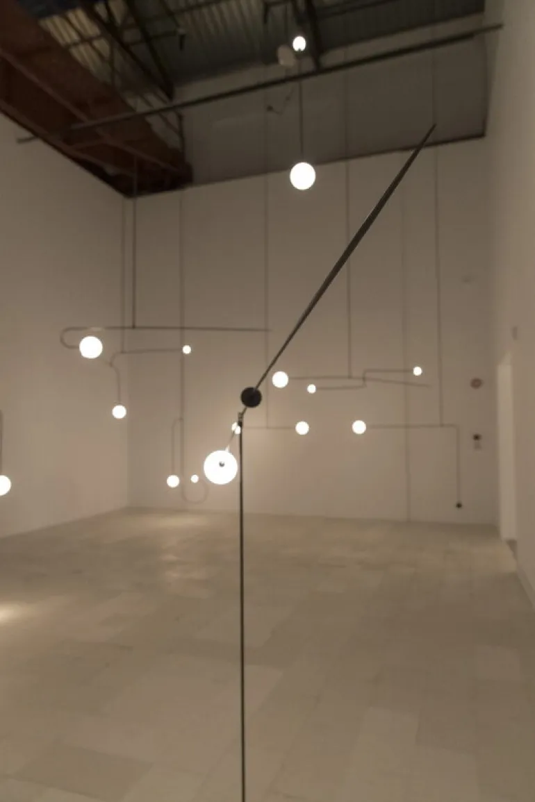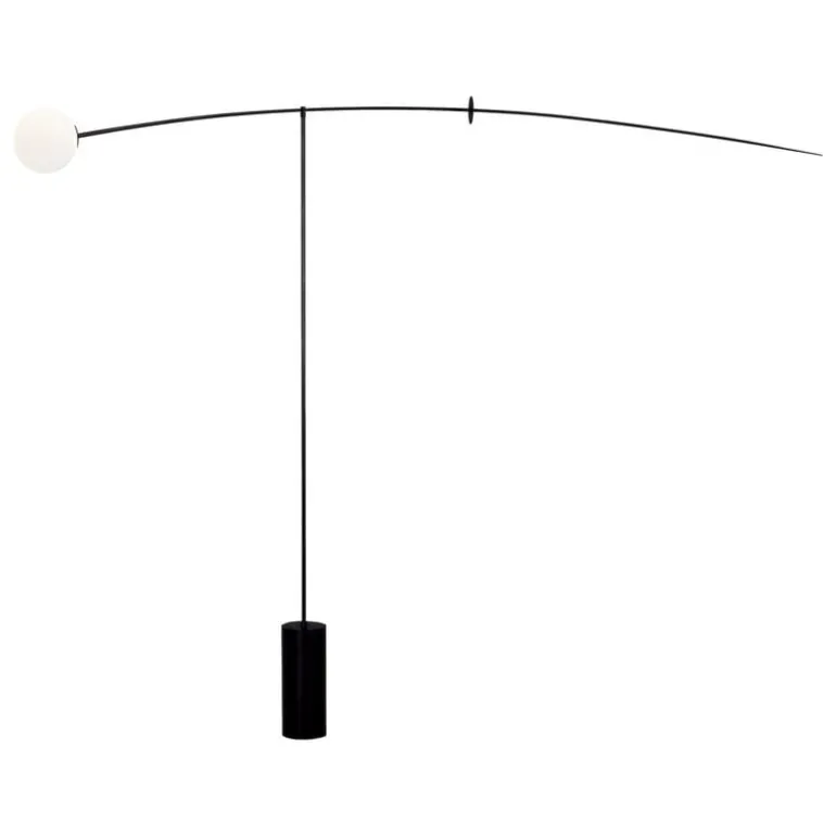 Mobile Chandelier 5 har en vackert patinerad svart mässingsram som håller en sfärisk skärm av handblåst opalglas. De eleganta linjerna och den luftiga strukturen gör den till en iögonfallande punkt, oavsett om den placeras i vardagsrummet, hotellobbyn eller i en mer krävande arkitektonisk miljö.