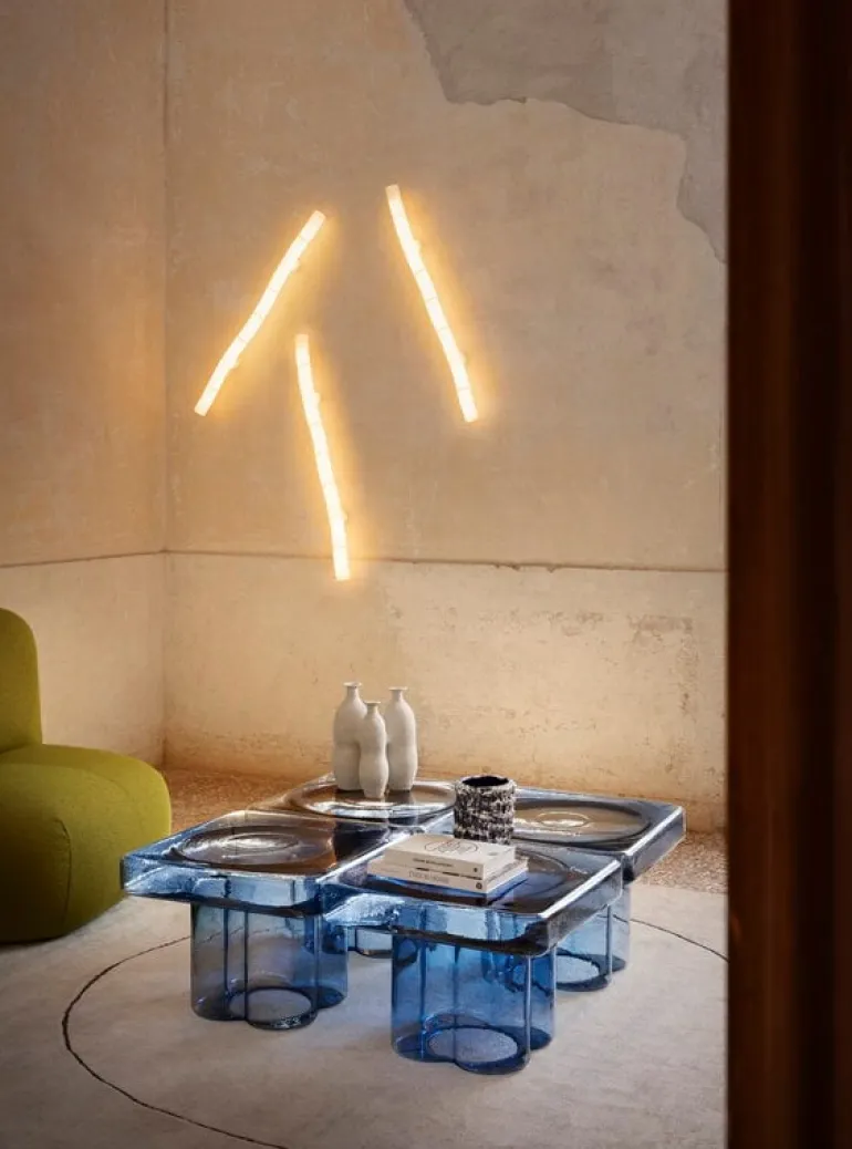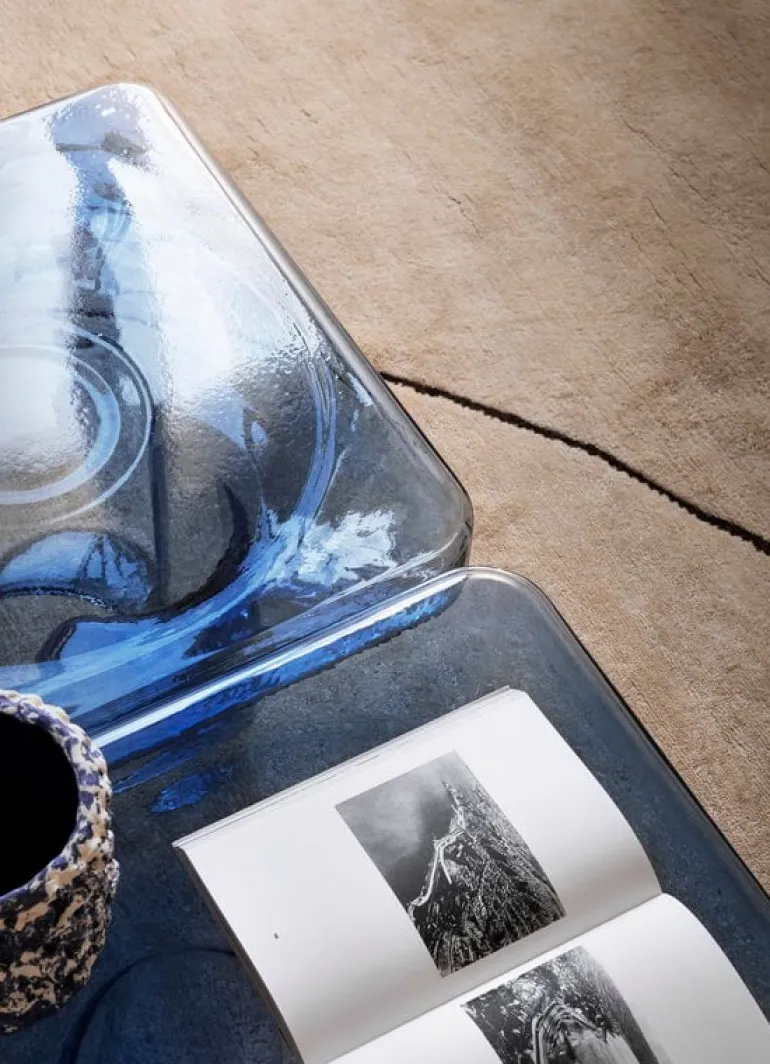 Miniforms sidobord Soda SQ har en imponerande och skicklig design som gör sig märkbar i alla rum. Den tjocka, kvadratiska bordsskivan stöds av ett starkt och robust ben med en struktur som påminner om en ömtålig blomma som öppnar sina kronblad – det mjuka intrycket skapar en glädjefull kontrast till bordets i övrigt robusta design. Det skulpterade bordet Soda är resultatet av tre glasblåsares skicklighet, som tillsammans har blåst och format ett glasbord med en unik look som kommer att glädja i vardagsrummet eller hallen, såväl som i offentliga miljöer.