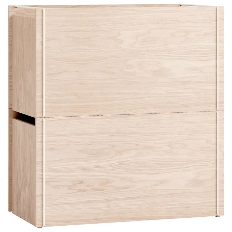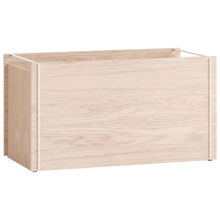 Moebes Storage Box ger tidningar, leksaker, kuddar eller mappar en minimalistisk och elegant förvaringsplats. Lådan är stapelbar och du kan ställa upp till tre av dem på varandra för att skapa ett förvaringssystem som inte tar upp så mycket plats. De kan också lätt plockas bort igen, tack vare metallhandtagen. Förvaringslådan i trä kan även vändas på sidan eller upprätt, för att användas som nattduksbord eller ett litet sidobord.