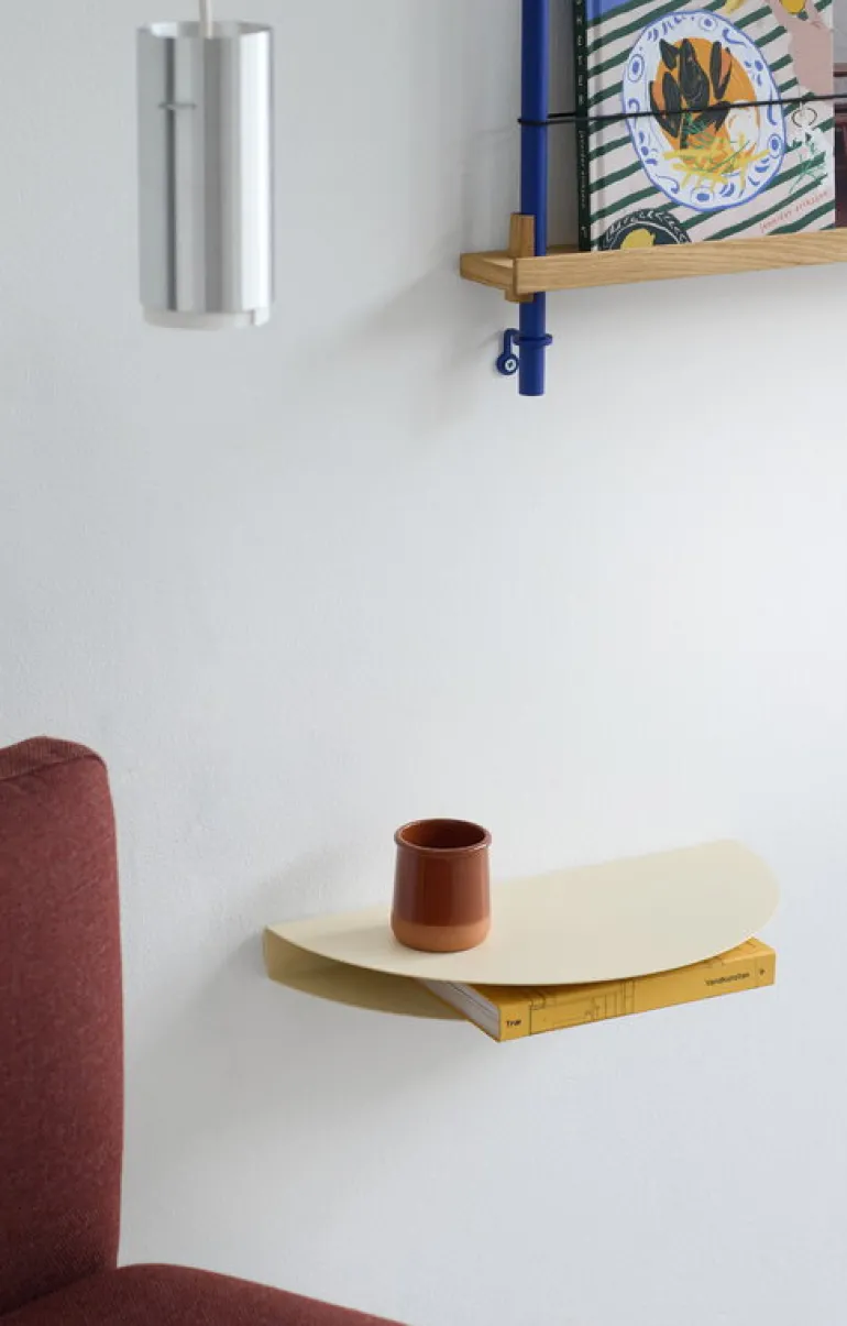Moebe:s Half Moon-hylla är ett uppiggande inslag i inredningen: ta en cirkulär plåt av stål, vik den två gånger med absolut precision, och du har en stilren vägghylla som passar in i alla skandinaviska hem. De två våningsplanen ger dubbelt så mycket förvaringsutrymme för vardagsföremål som nycklar, tidningar och smycken, i hallen eller var du vill ha den. Namnet Half Moon, som betyder halvmåne, syftar på hyllans form och den är enkel att fästa på väggen med två skruvar. Hyllan är tillverkad av pulverlackerat stål och finns i två storlekar och flera färger.