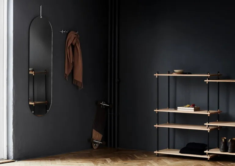 Moebes klädhängare består av en vågrätt metallstång med fyra pinnar som kan flyttas längs stången. Tack vare dess eleganta utseende passar Moebes klädhängare lika bra i hallen som i sovrummet. Klädhängaren kan monteras på väggen genom att placeras över två L-krokar.