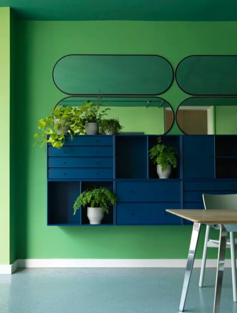 Spegeln är en del av Montana Selection, en kollektion av förvaringsmöbler och inredningsdetaljer som karakteriseras av sitt grafiska, enkla formspråk och subtila nordiska färger. Montana-produkterna är framtagna av formgivaren Peter J. Lassen och alla föremål är både designade och tillverkade i Danmark.