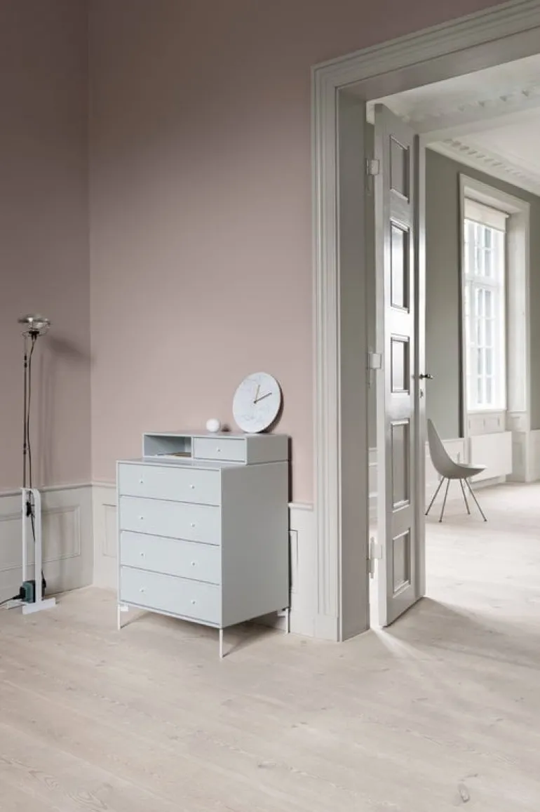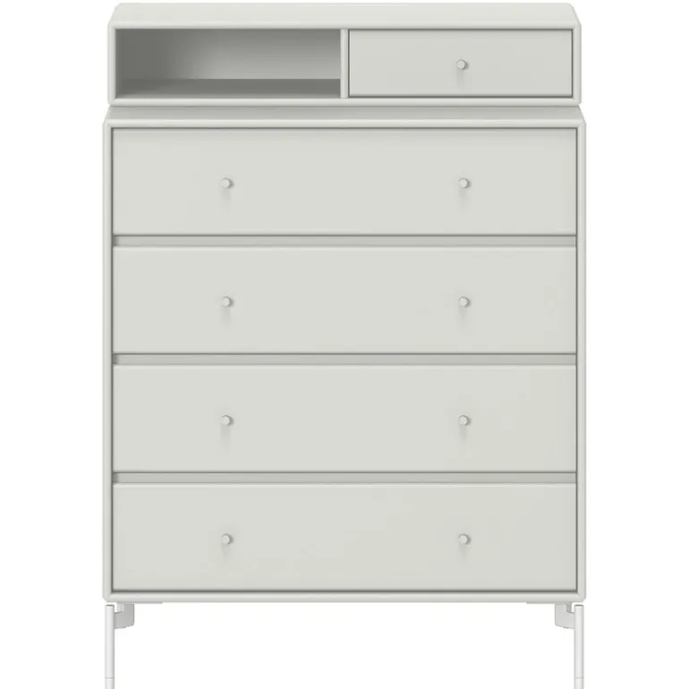 Montana Furnitures Keep är en klassisk och enkel byrå som passar i alla rum. Den står på tunna metallben och består av fyra lådor och en toppmodul, med en liten låda och en öppen hylla.