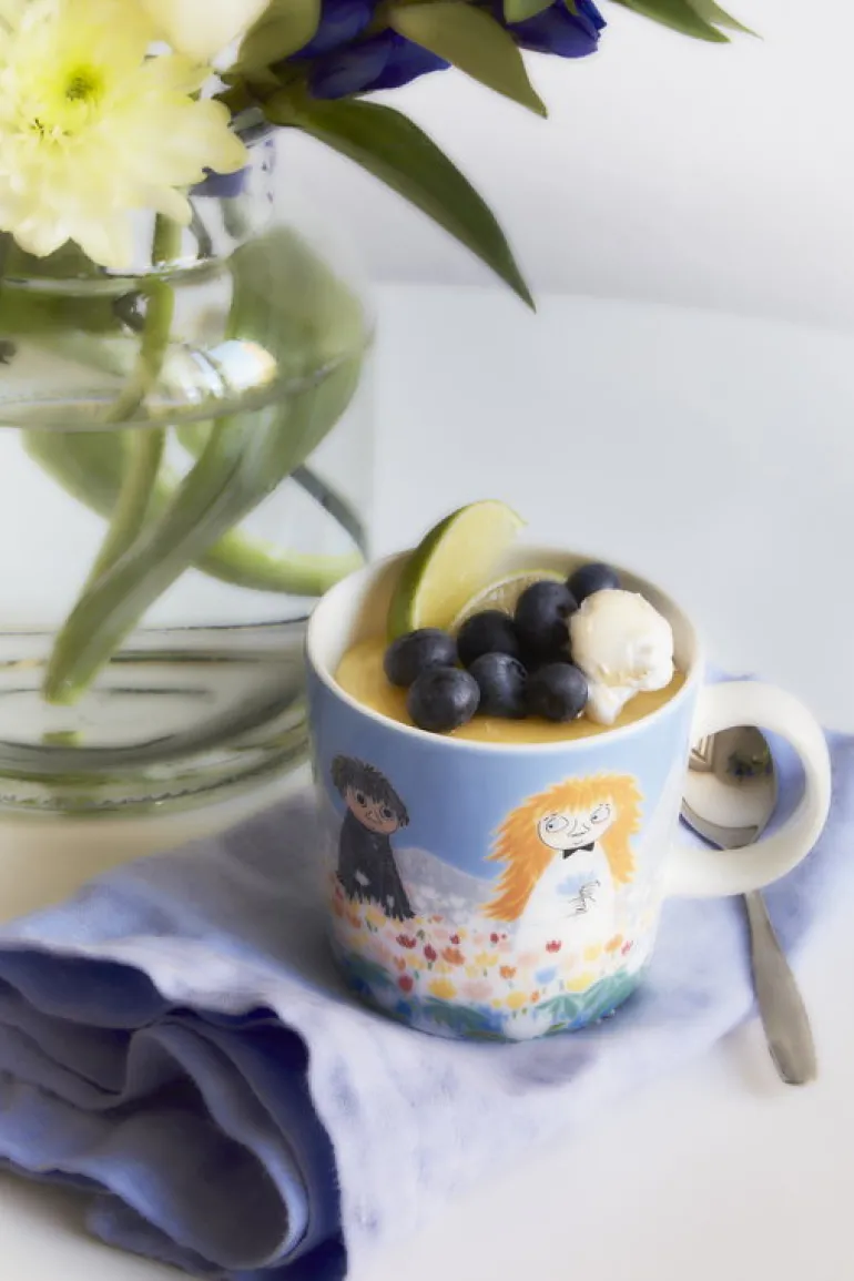 Muggen Friendship, från Arabias Muminkollektion, har en illustration av en scen från Tove Janssons älskade bilderbok, Vem ska trösta knyttet? (1960). Illustrationen visar den magiska stunden när berättelsens ensamma, skygga huvudkaraktär Knyttet, för första gången träffar Skruttet på en äng fylld av vildblommor.