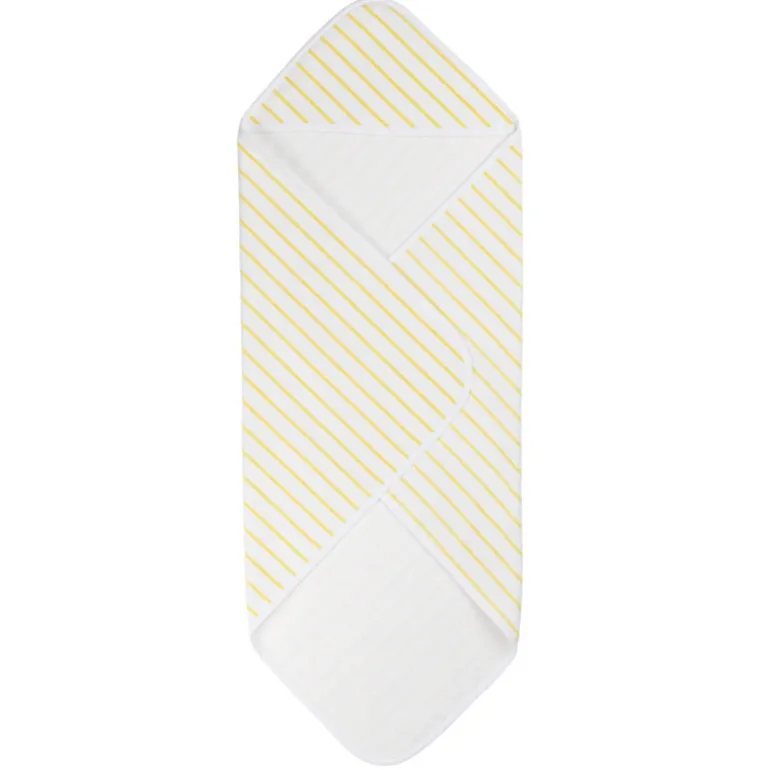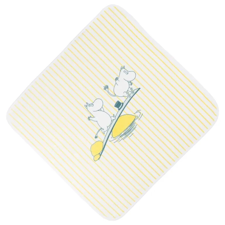 Huvhandduken Mumintrollet från Mumin Arabia sveper in barnens badstund eller strandutflykten i en förtrollande Mumindalen-känsla! Den här härligt mjuka och stretchiga handduken i velour är tillverkad av ekologisk bomull och har en huva i ena hörnet för att skydda huvud och öron på de små från vindar och blåst. Badrocken med huva har fräscha gula ränder och en illustration som skildrar när Muminpappan och Mumintrollet är på väg att hoppa i plurret.