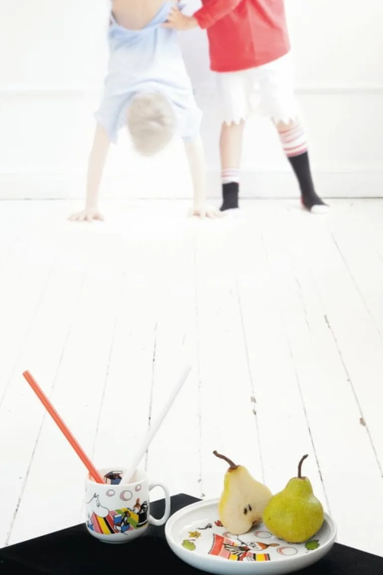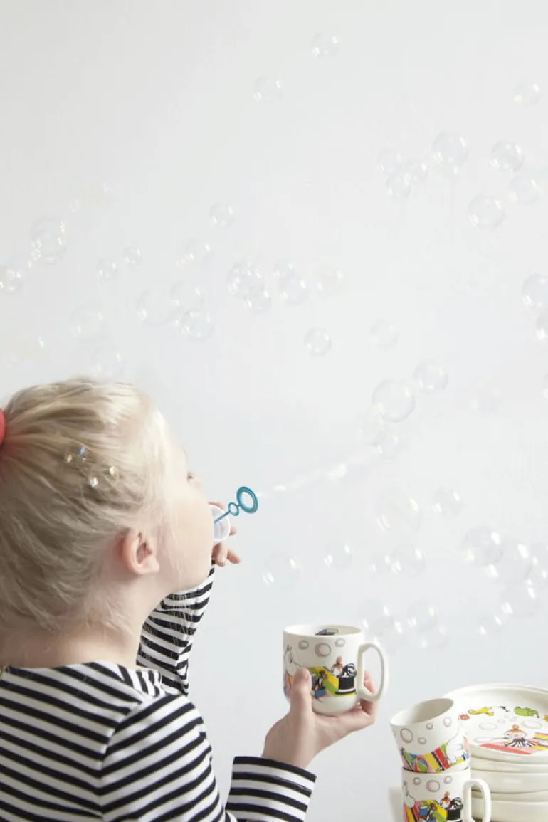 Barnservisen Lilla My från Arabia består av en liten tallrik och mugg i keramik, designad av Richard Lind. Den roliga illustrationen på tallriken visar Lilla My som blåser såpbubblor medan Mumintrollen försöker gömma djur som rymt från zoo. Temat fortsätter på muggen, där Lilla My har sällskap av Mumintrollet och en djurkompis. Det fina setet kan användas i diskmaskin, frys, mikrovågsugn och ugn.