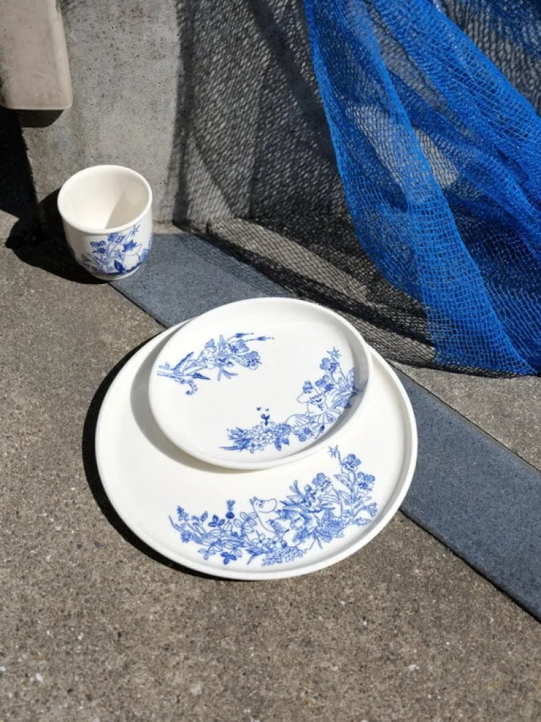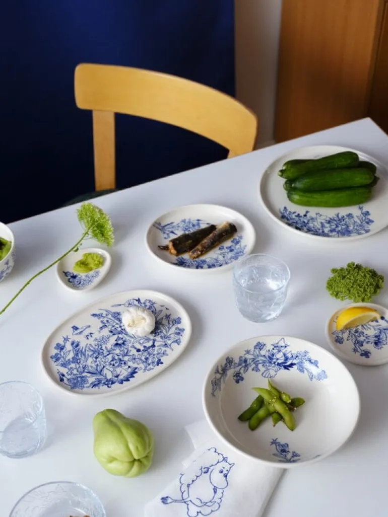 Moomin Arabias Haru-tallrik passar lika bra till enskilda portioner som till att servera mat som ska delas. Mumintallriken är dekorerad med ett fräscht och nostalgiskt blåvitt tema som visar de älskade Muminfigurerna tillsammans med blommor och växter från den nordiska skärgården.