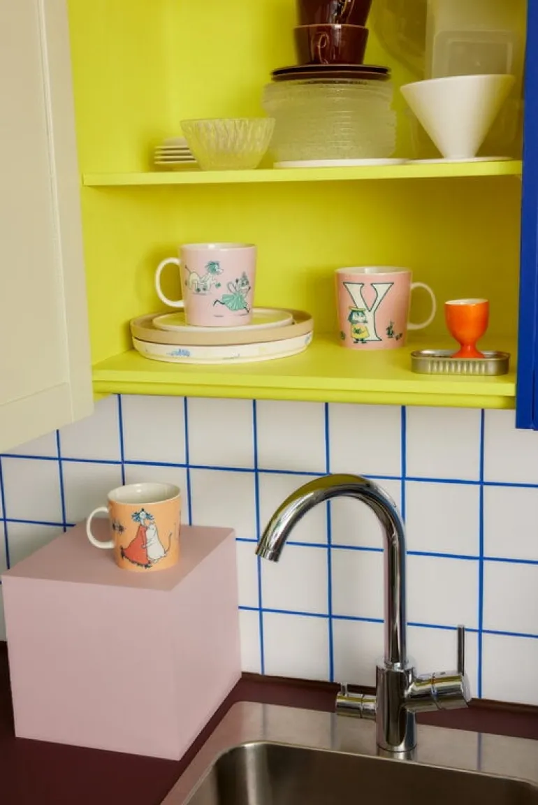 S-muggen ingår i initiativet ”Från A till Ö med Mumin” som uppmärksammar läskunnighetens betydelse och sprider läsglädje. Bokstäverna på Muminmuggarna är baserade på Tove Janssons handtecknade versaler och textning som hon skapade till boken Muminpappans memoarer, men också till hennes kartor över Mumindalen. Muggarnas form känns igen från Iittalas Teema-serie, men till skillnad från de flesta andra Muminmuggar är storleken på ABC-muggarna större: 4 dl.
