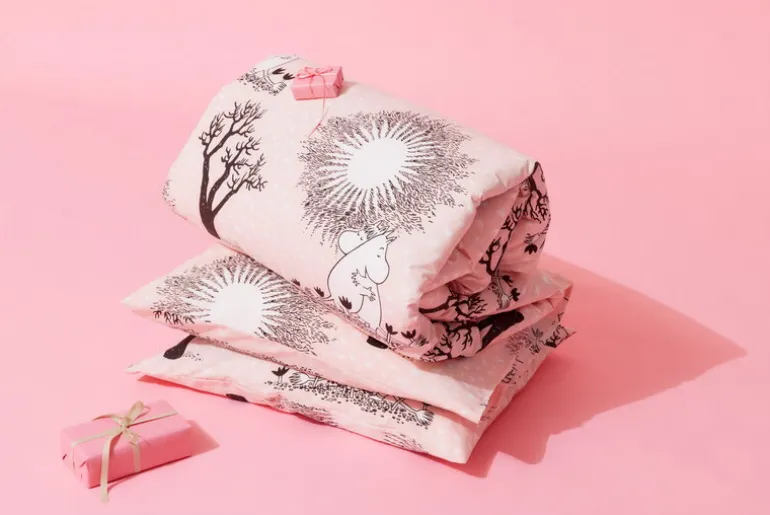 Med påslakansetet Love från Moomin Arabia kan du ta den förtrollande atmosfären i Mumindalen med dig in i sovrummet, ett måste för alla Mumin-fans! Påslakansetet för enkelsäng pryds av den bedårande ”Love”-illustrationen där Snorkfröken och Mumintrollet möts i en varm och kärleksfull kram. Det här är en av de mest kända Muminteckningarna, inspirerad av seriestripparna som skapades av Tove och Lars Jansson.