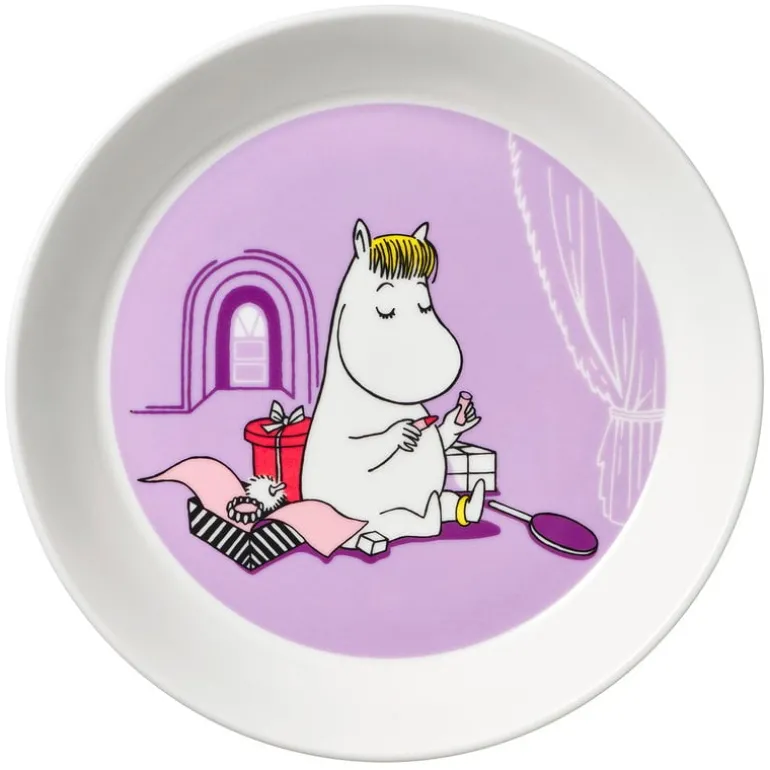 Snorkfröken-tallriken från Arabias Muminkollektion har en illustration där den uppmärksamhetsälskande Snorkfröken provar läppstift för första gången men är osäker på hur man ska göra. Illustrationen baseras på serietidningen Muminfamiljen på Rivieran från 1955.