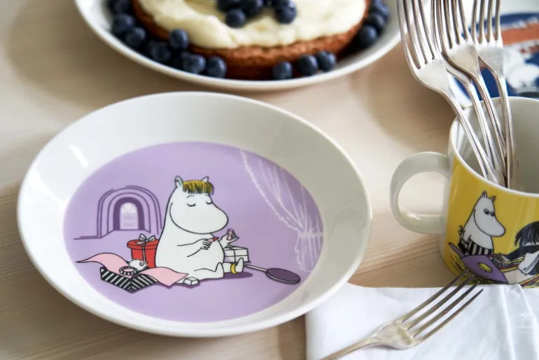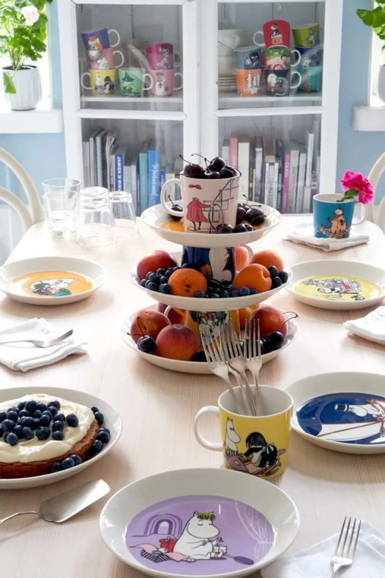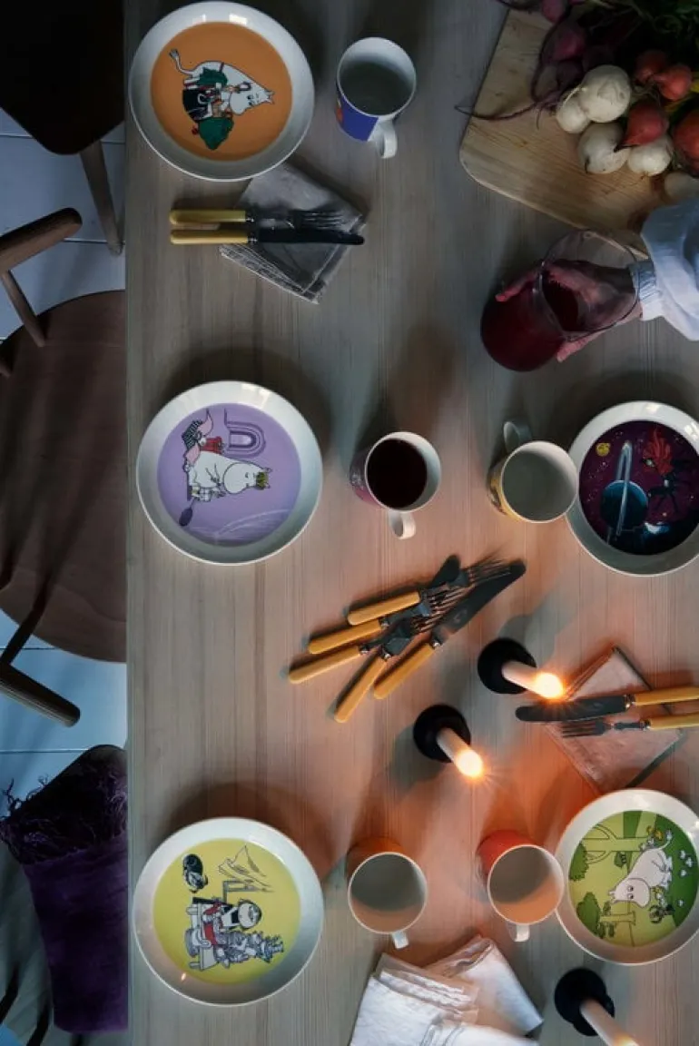 Muggarna, skålarna och tallrikarna i Arabias Moomin Classics-kollektion avbildar karaktärerna i Mumindalen. De första delarna av Arabias Muminporslin släpptes redan på 1950-talet, medan massproduktionen inleddes först 1990. Alla illustrationerna skapas av Tove Slotte som hämtar inspiration från Tove Janssons original. Själva formen kommer från Arabias tidlösa Teema-porslin i keramik som designats av Kaj Franck.