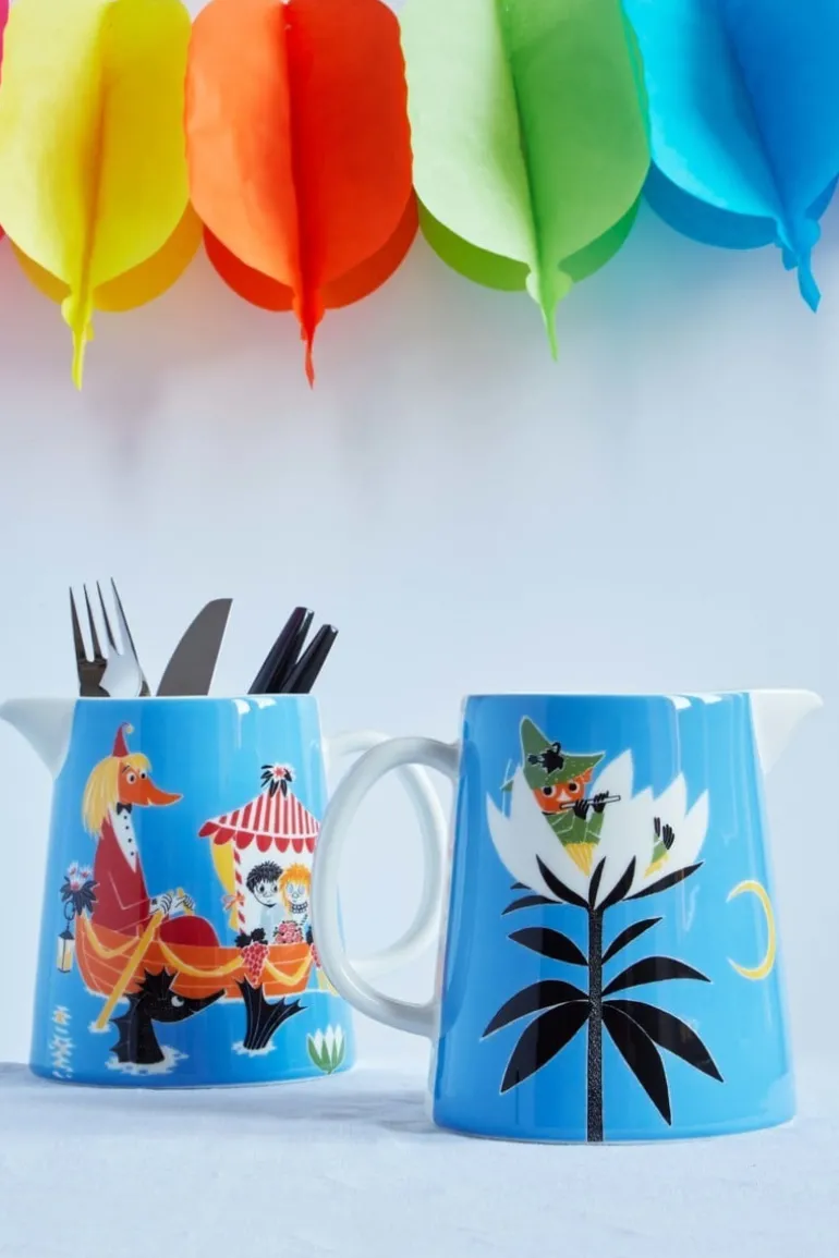 Arabias karaff Vänskap är prydd med ett underbart tryck mot en blå bakgrund. Mumins Vänskap-kollektion har försetts med illustrationer från Tove Janssons sagobok Vem ska trösta Knyttet?, där den ensamme Knyttet efter många spännande äventyr så äntligen får en riktig vän. Den keramiska karaffens volym är 1 liter och den har ett vitt handtag och vit pip.
