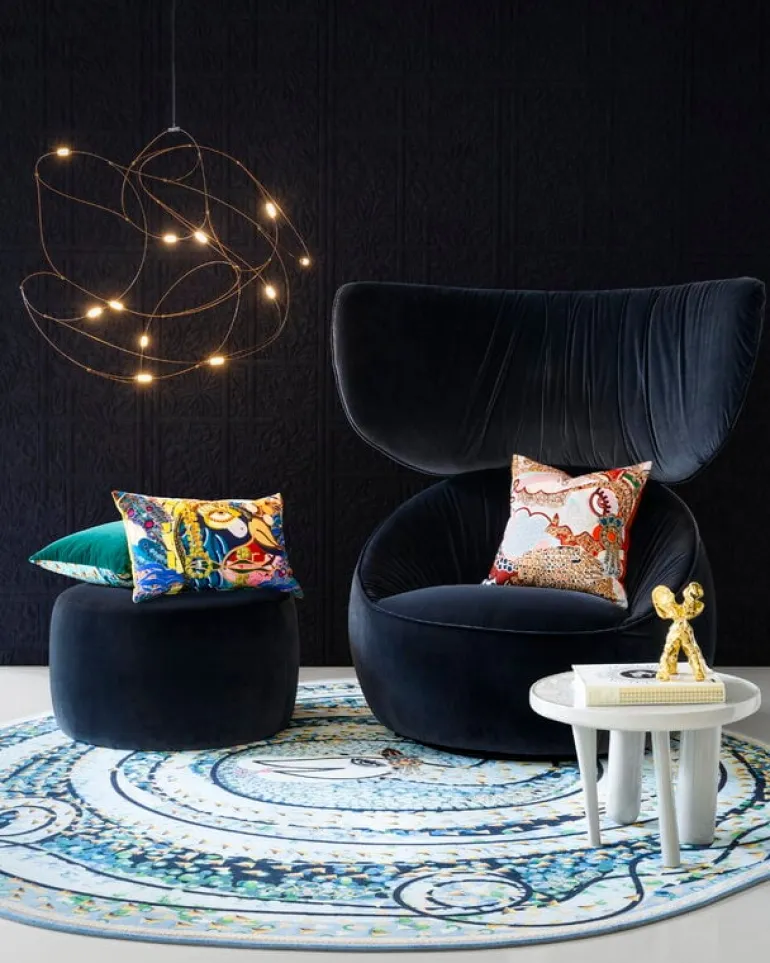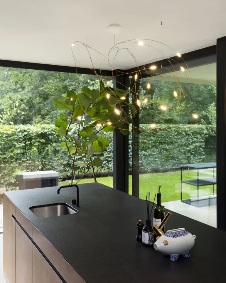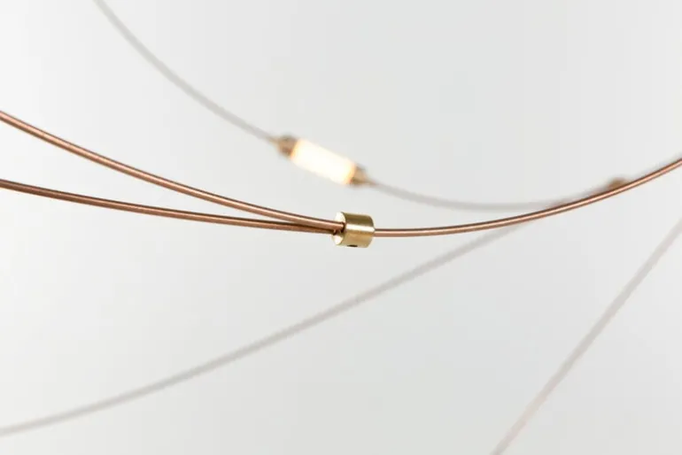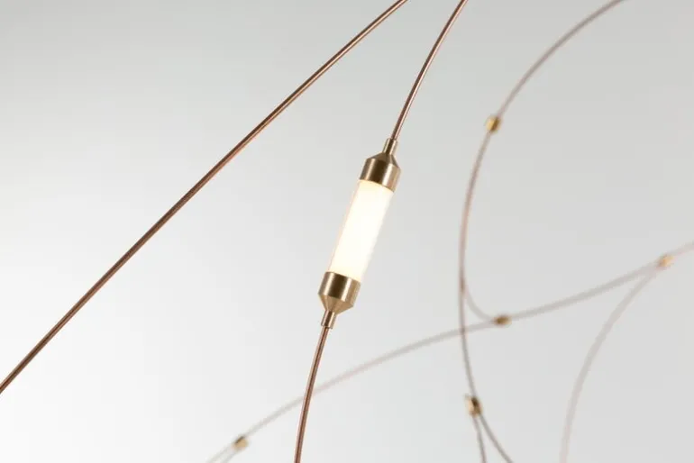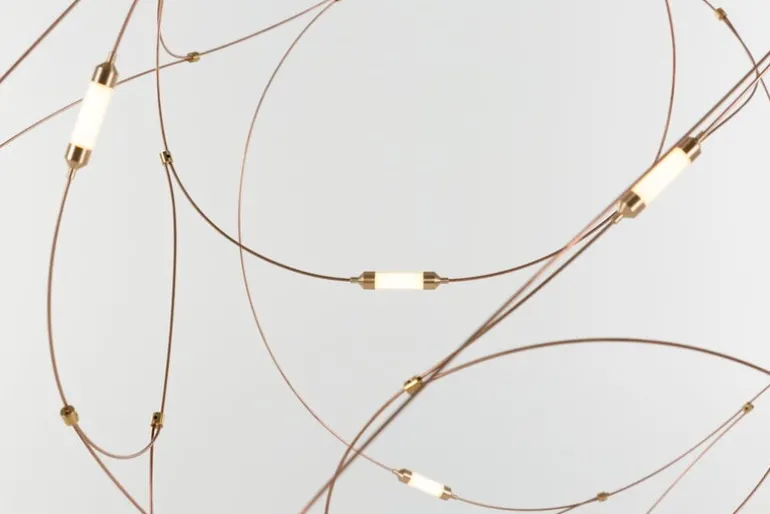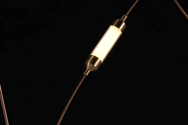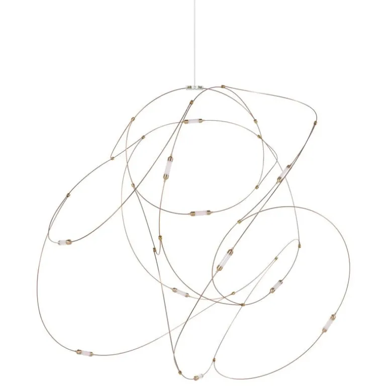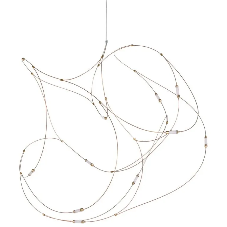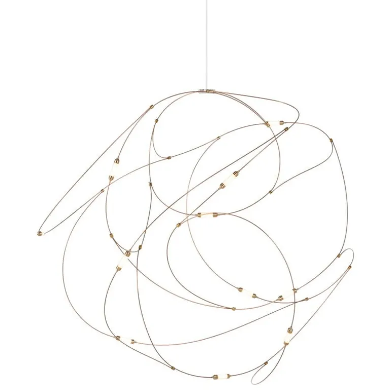 Mooois hänglampa Flock of Light för med sig magiska gnistor av ljus till alla rum. Inspirerad av skymningstimmen mellan dag och natt, består hänglampan av små LED-lampor och en virvlande moln av brons- och mässingstråd. Flock of Light är som en ljusskulptur som svävar mjukt i luften, och dess silhuett påminner om skymningshimlen eller ett moln belyst av solens första strålar.
