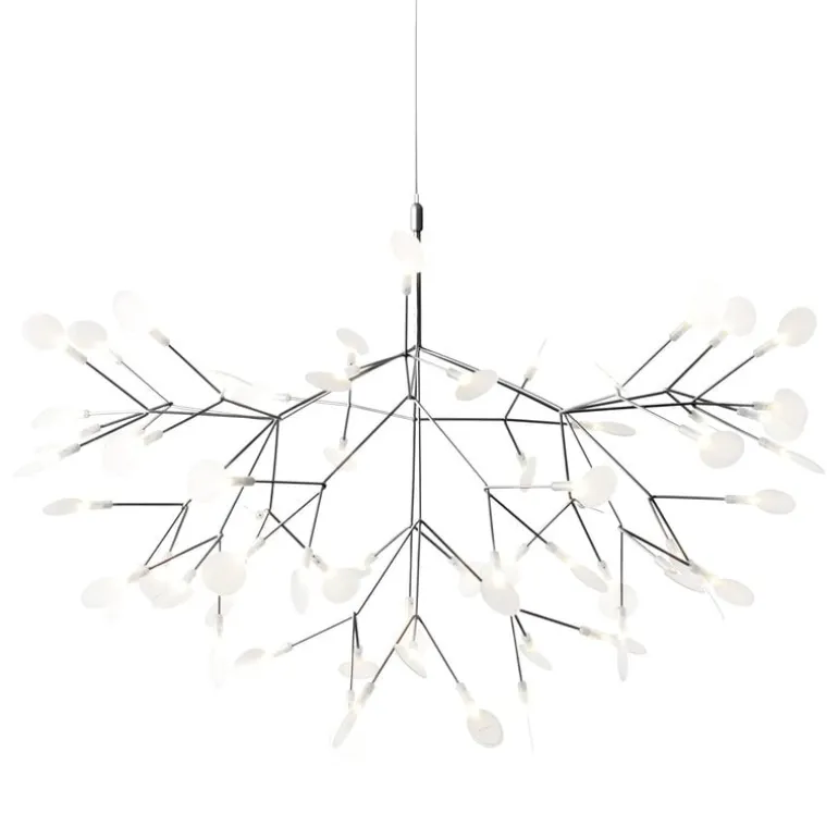 Mooois hängande pendellampa Heracleum III hämtar inspiration från naturen, mer specifikt från den unika formen hos björnloka. Designad av Bertjan Pot, är den delikata pendeln en fascinerande kombination av natur och teknisk innovation: Heracleum III består av en metallram dekorerad med belysta polykarbonatskivor som påminner om blad eller blommor. Skivorna kan justeras något beroende på vilket utseende du strävar efter.