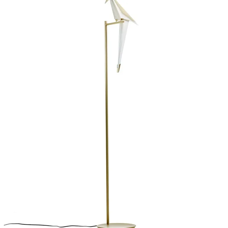 Golvlampan Perch kommer med en vacker origamifågel, toppad med näbb och svans i mässing, där den graciöst balanserar på en tunn gren. Genom att röra den skinande fågeln kommer den plötsligt till liv med en mjuk svängande rörelse. Den poetiska lampan designades av Umut Yamac.