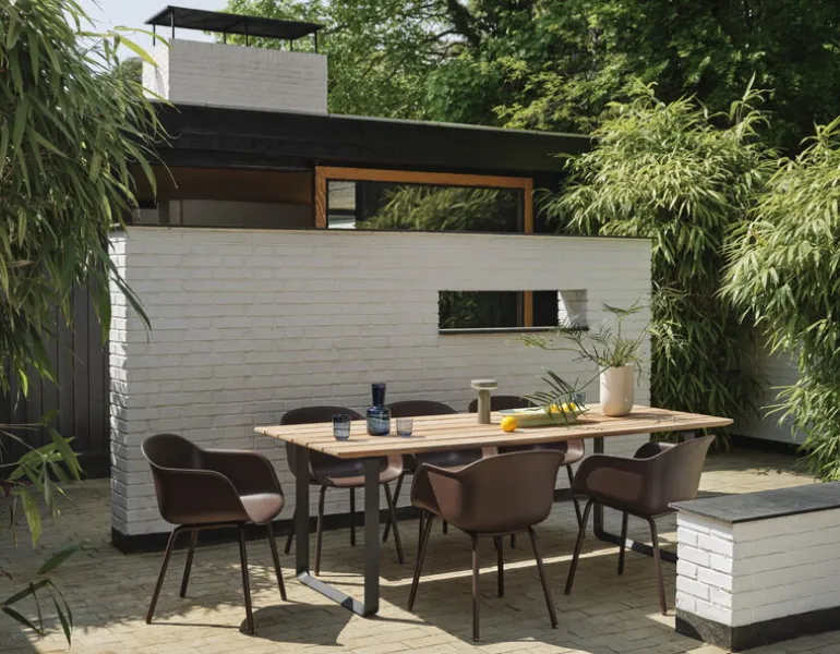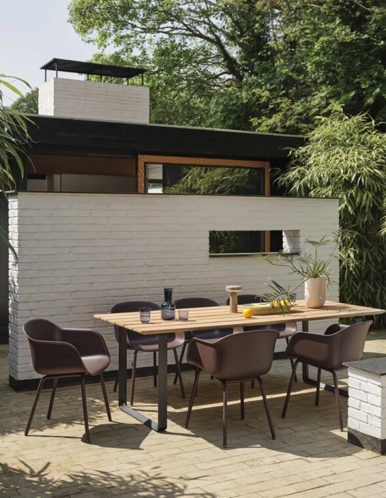 Bordet 70/70 Outdoor är designat av TAF Studio för Muuto, och har nästan ett anonymt uttryck med vackra detaljer. Bordet står på två fyrkantiga ramar i gjuten aluminium med dimensionen 70 x 70 cm, därav namnet 70/70. Bordsskivan, som är gjord av naturlig mahogny, kan med fördel användas utomhus då den klarar skiftande väderförhållanden. Med tiden kommer bordsskivan att få en karakteristiskt silvergrå patina. Om du tycker bättre om mahognyns ursprungliga utseende så behöver du inte vara orolig – kom bara ihåg att olja in bordet då och då för att ge det en varm lyster och en rödaktig färgton! Bordet 70/70 Outdoor går väl ihop med skandinavisk estetik och är ett perfekt komplement i en rad olika miljöer, allt från grönskande trädgårdar till mer asketiska, urbana uteplatser.