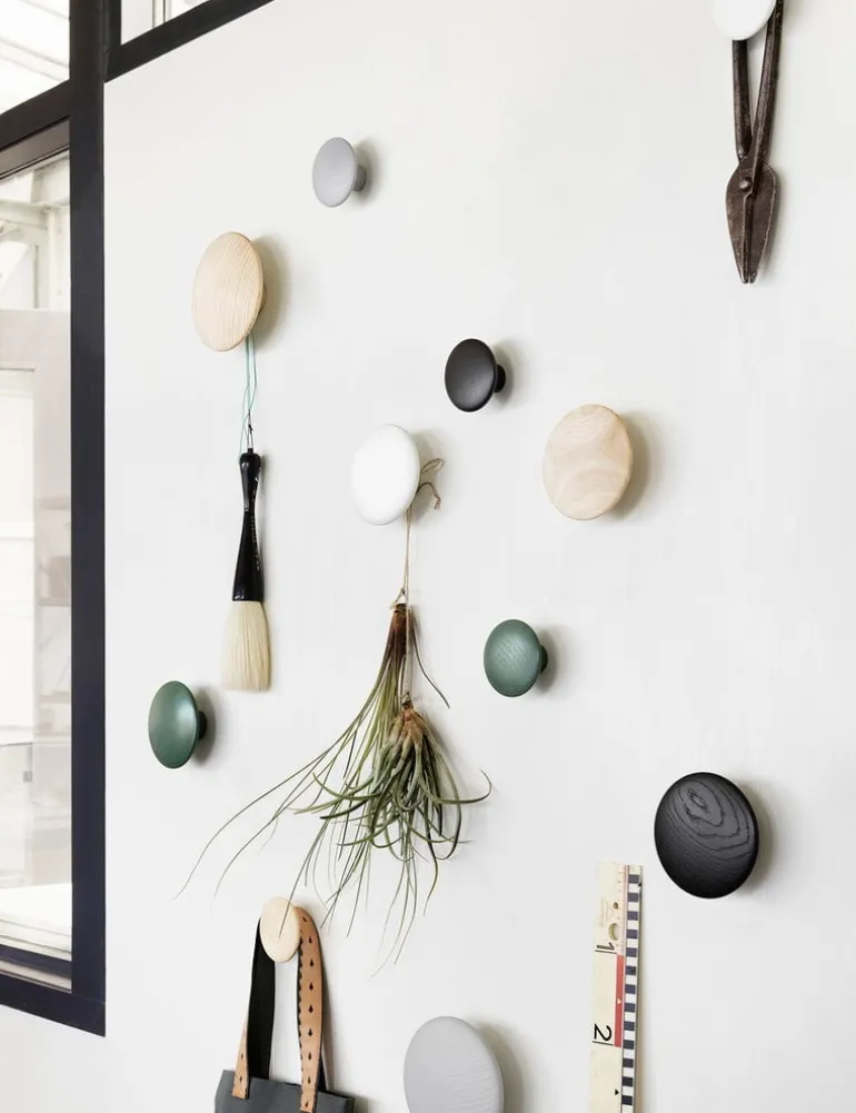 Muutos Dots Wood-krokar, som designats av Lars Tornøe, är ett utmärkt sätt att hänga dina kläder, väskor, handdukar och accessoarer – du behöver bara bestämma vad och var! Dots Wood-krokarna är tillverkade i lent polerat trä format som en cirkel, och skapar en livfull och lekfull atmosfär i hallen, köket eller sovrummet. Den populära Dots-familjen kännetecknas av personliga krokar i olika storlekar, färger och material – du kan arrangera ett unikt grafiskt mönster på väggen, eller förnya en förvaringsmöbel genom att använda krokarna som handtag på skåp eller lådor. Var inte rädd att använda fantasin!