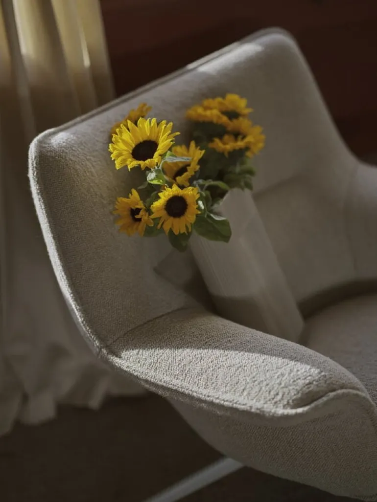 Muutos Doze-fåtölj kännetecknas av skandinavisk minimalism i kombination med det djärva uttryck som är typiskt för 70-talets design. Fåtöljen, som är designad av Anderssen & Voll, har ett distinkt brett ryggstöd – markerat med sömmar som ger definition åt formen – och smala, rörliknande ben som framhäver fåtöljens robusta ram. Den vridbara fåtöljen passar perfekt i loungeområden på hotell eller kontor, men även hemma när du vill koppla av framför tv:n eller med en bra bok.