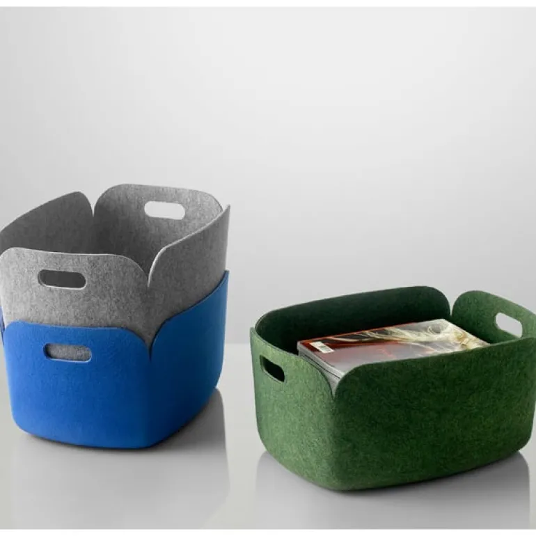 Restore, designad av Mika Tolvanen, är en samling multifunktionella brickor och korgar, formade av slitstarkt kompositmaterial av polymerfilt. Det innovativa materialet är tillverkat av fibrer från återvunna flaskor. Restore brickor och korgar har en enkel och trevlig form som passar både hemma och på kontoret.