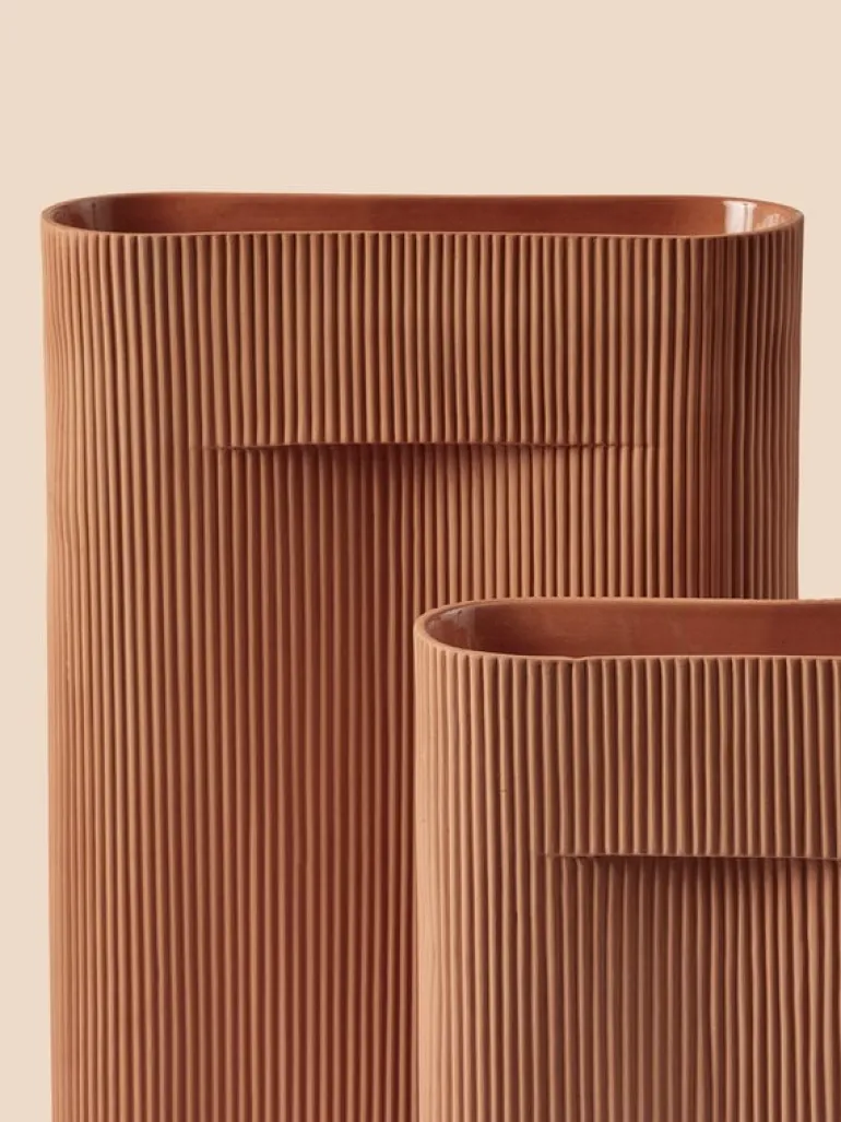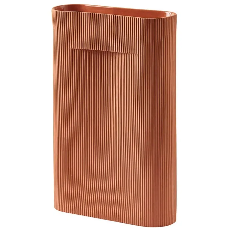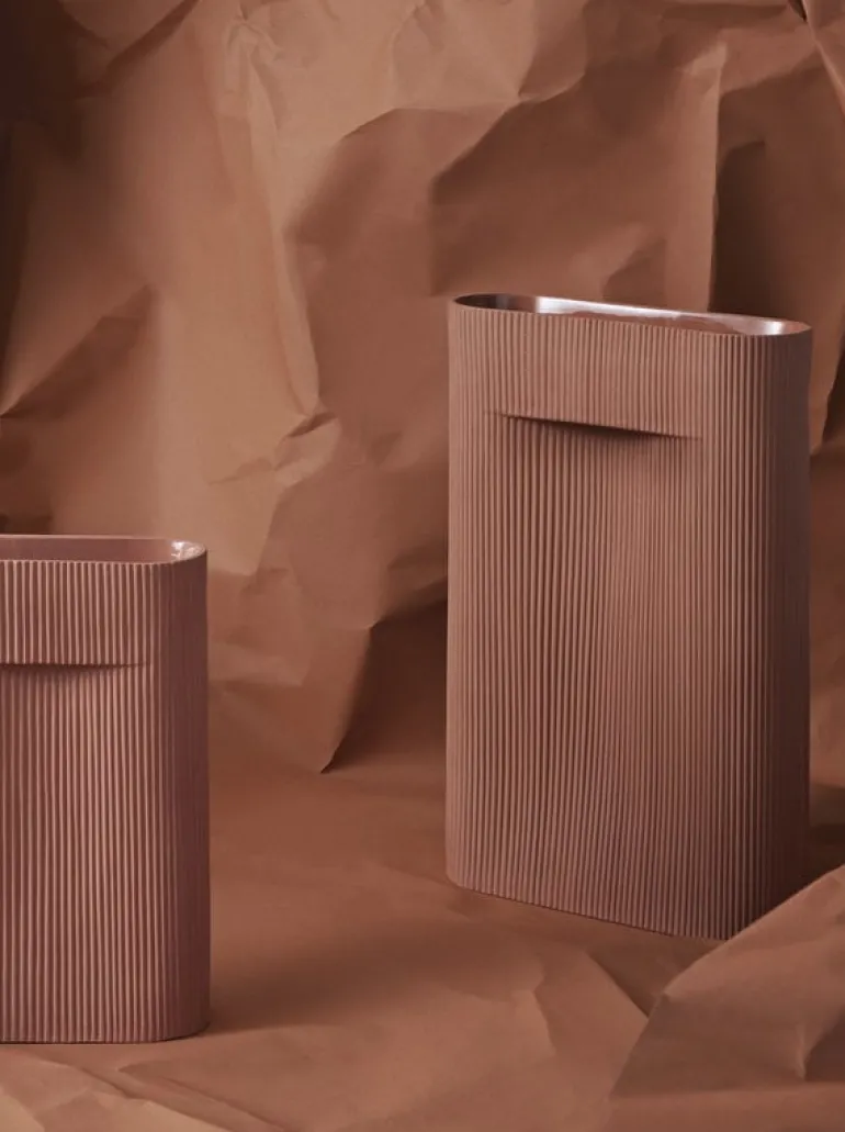 Ridgevasen från Muuto karaktäriseras av en distinkt form och vertikala linjer som drar sig längs med vasens oglaserade yttre. Vasen designades av Helsingfors-baserade Studio Kaksikkos Wesley Walters och Salla Luhtasela. Inspirationen fanns i Paris, nämligen en fasad de stötte på. Vasens skulpturala form är designad att lämna ett avtryck oavsett om det är blommor i eller ej. Utöver det är vasen tillräckligt stor för att placeras för sig själv på golvet.